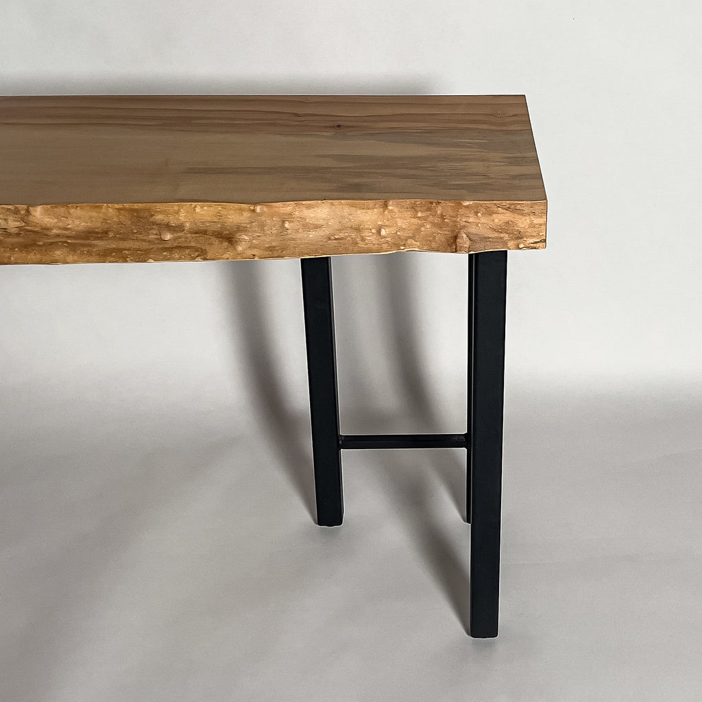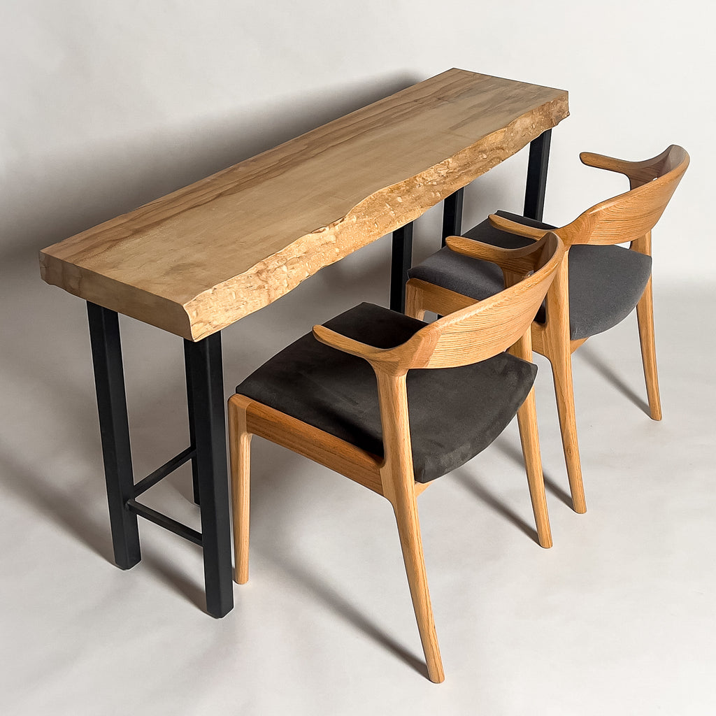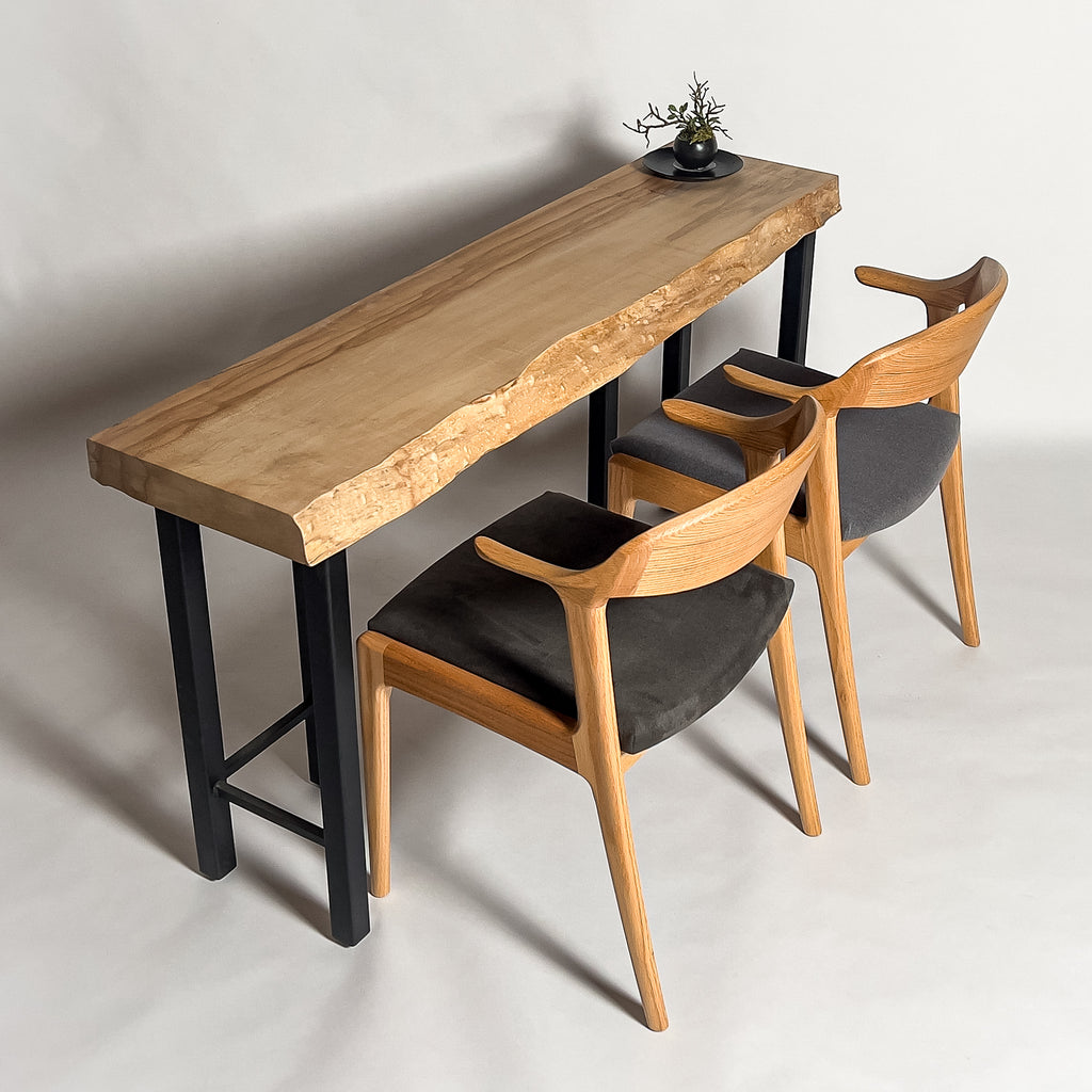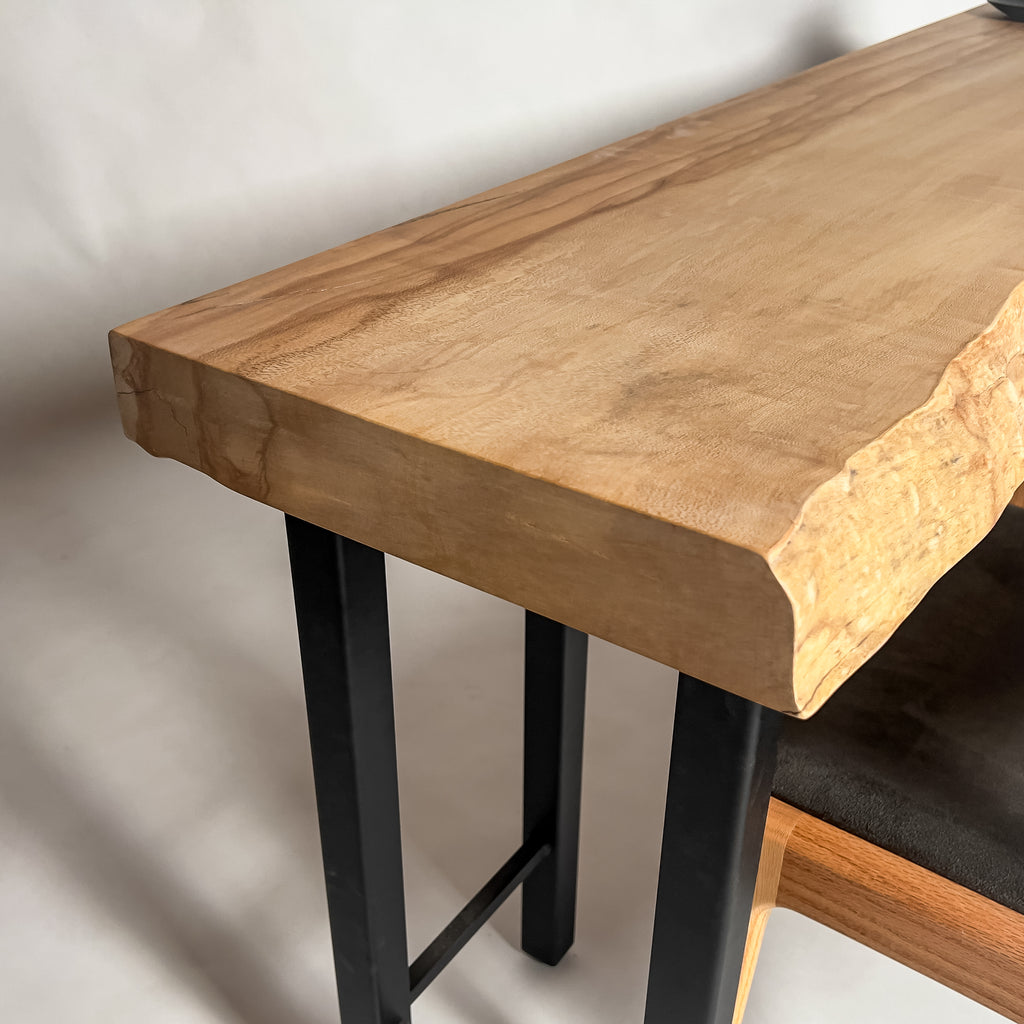 緻密で滑らかな木肌を持つ楓は、淡い乳白色と上品な光沢が魅力。硬く粘り強い性質を持つため一枚板テーブルに適し、経年変化で飴色へと深まる美しさと高い耐久性を兼ね備えています。
