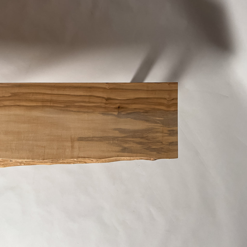 寒暖差のある土地でゆっくり育った楓です。年輪が細かく重なり、縮杢が現れました。淡い色味は光を含み、水面のように揺らぎます。耳の動きを残した上品な仕上げ、静かな躍動感が空間に穏やかに広がります。