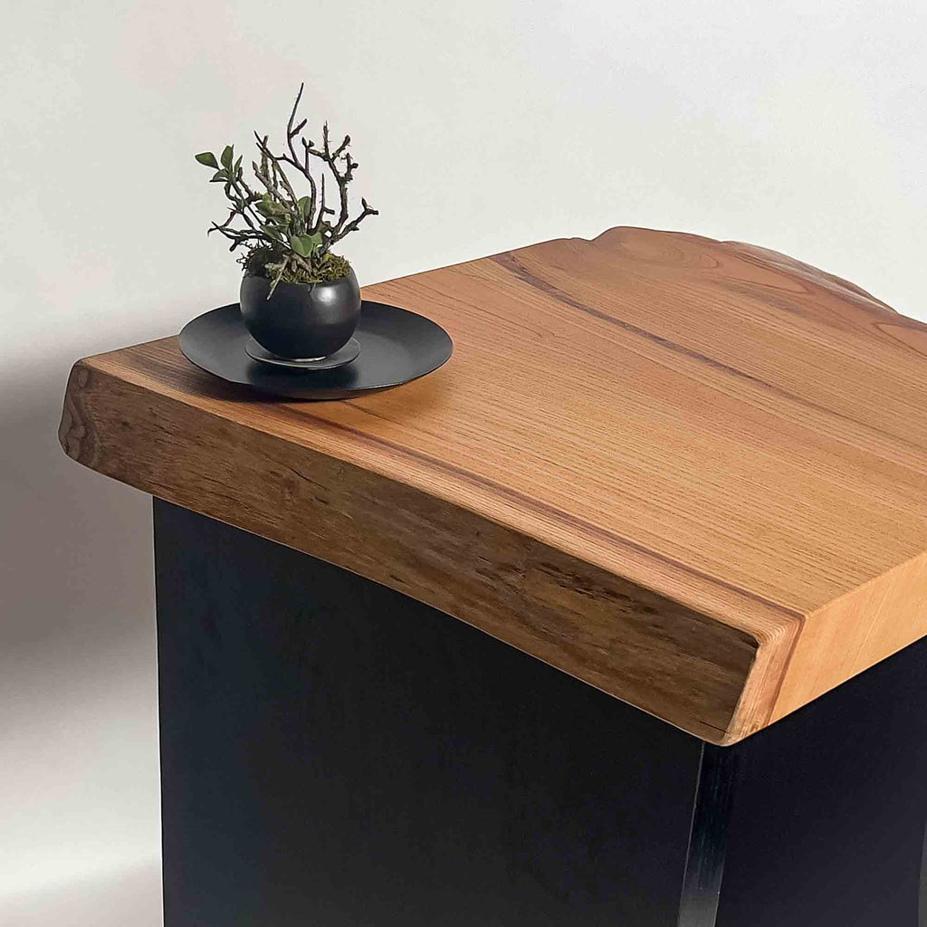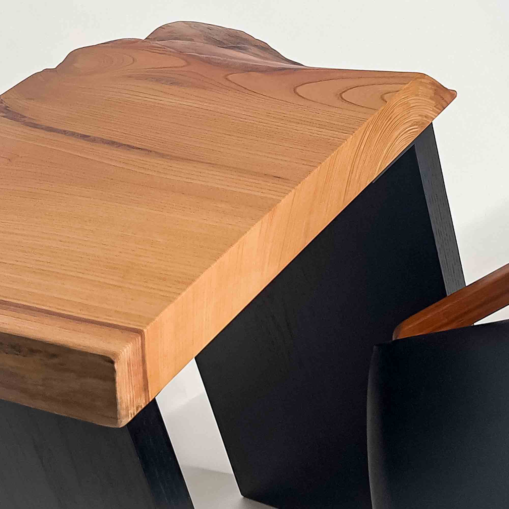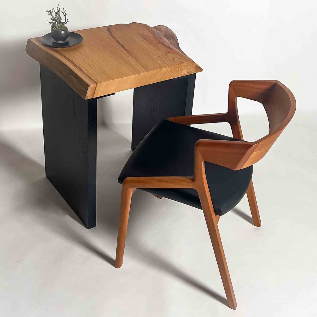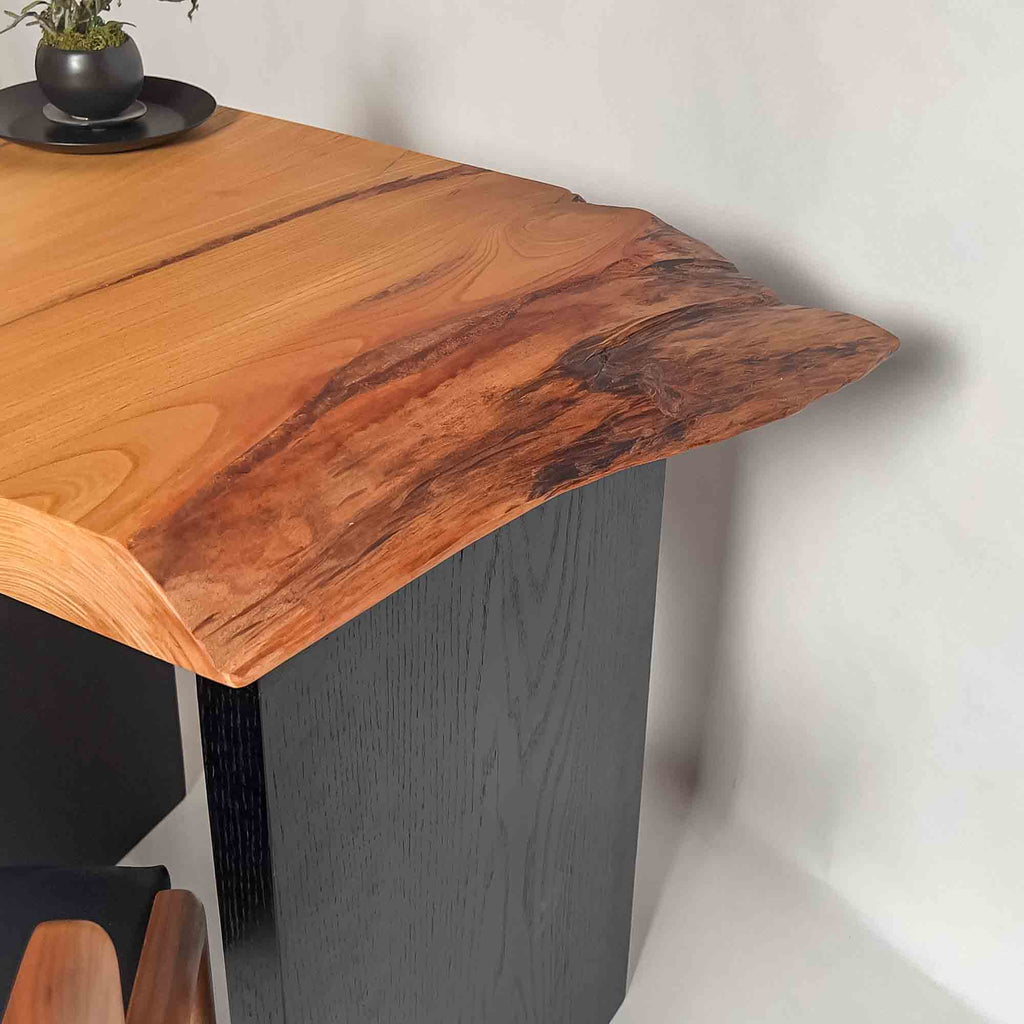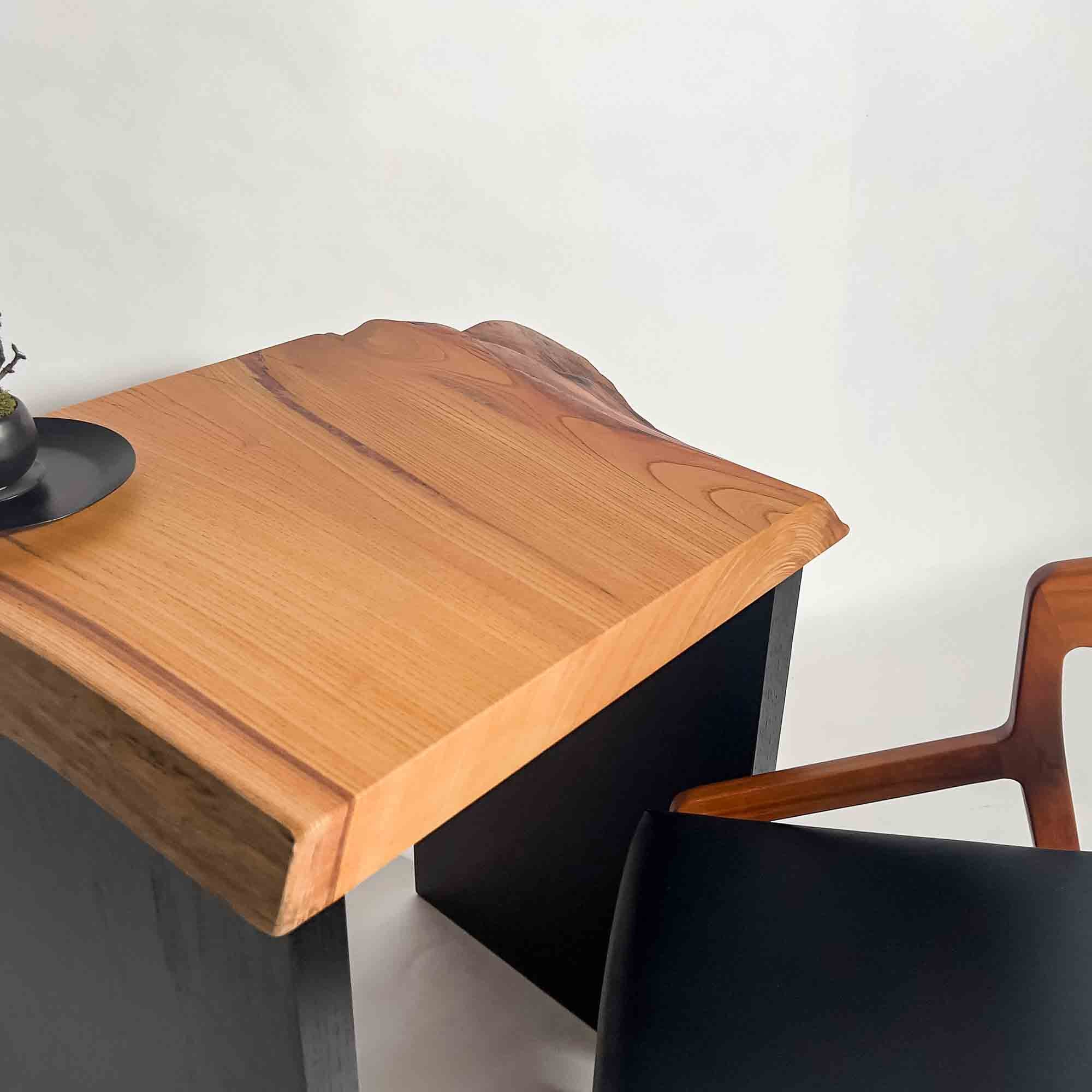 空間相性:和モダン 整った木目の流れと右耳の濃い色、直線を残しつつ崩した天板形状が静かな緊張感をつくり高相性です。 |