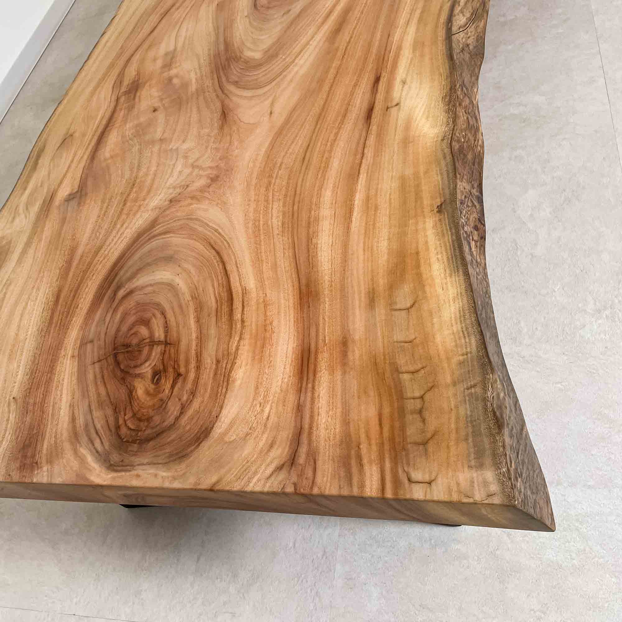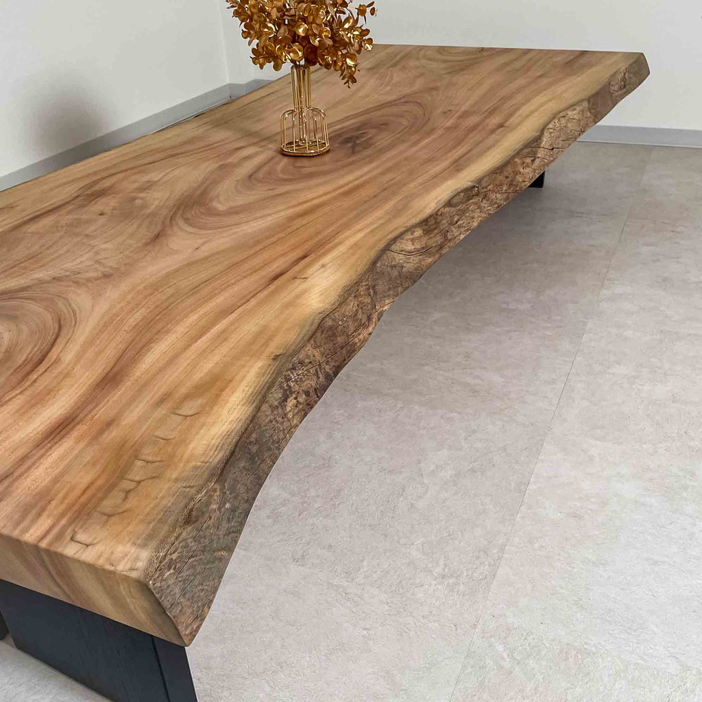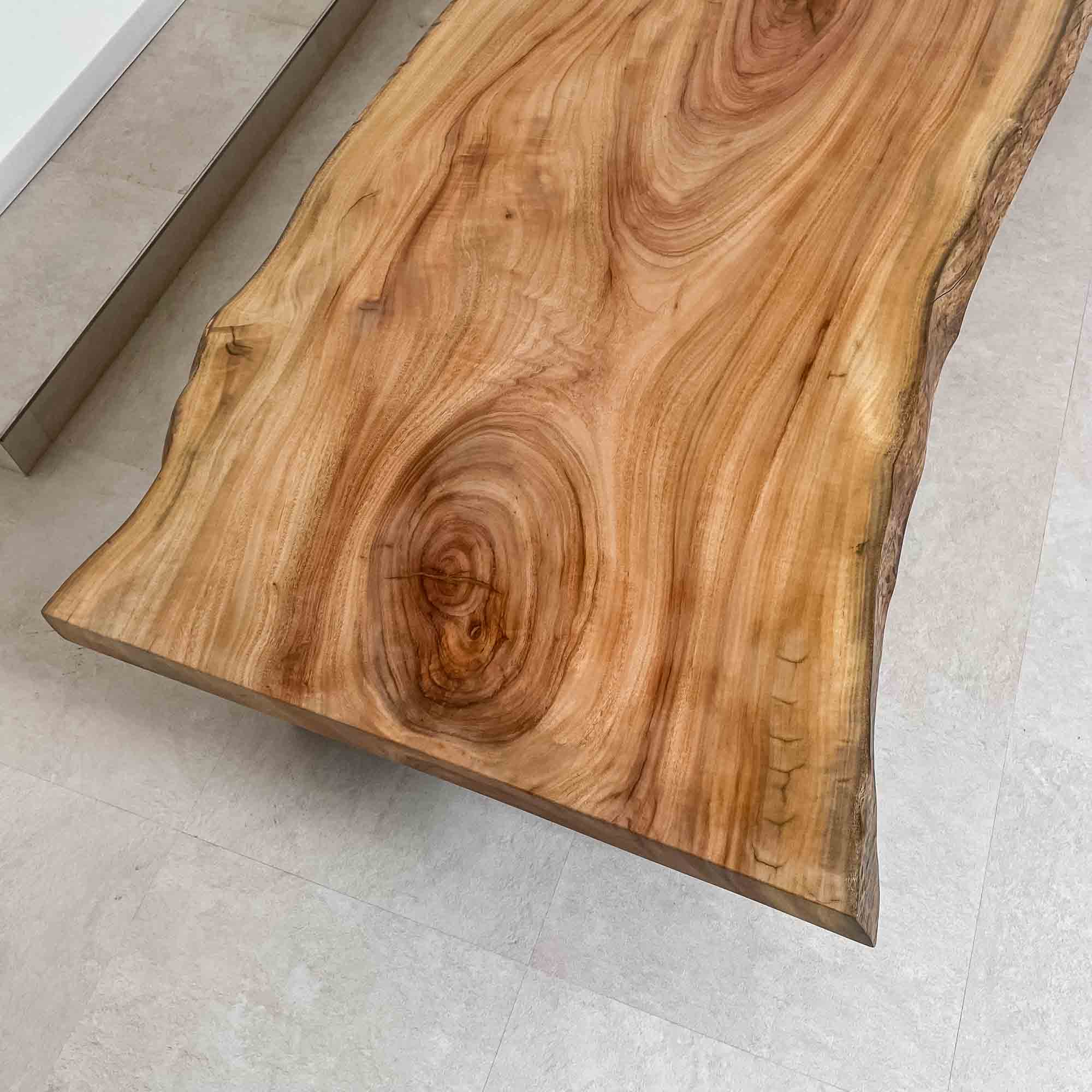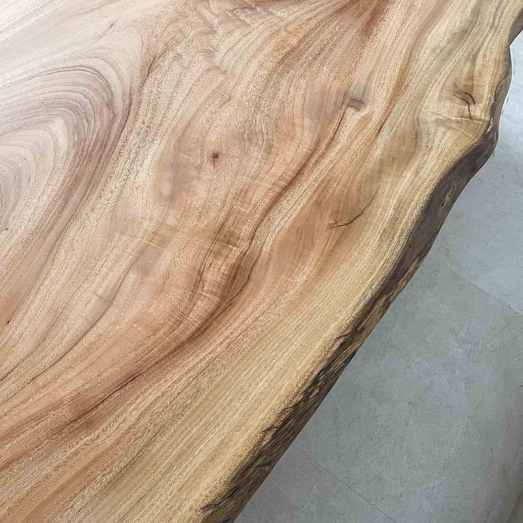 複数の板をつなぎ合わせたものとは異なり、途切れることなく続く杢目は自然の美しさをそのまま映し出します。