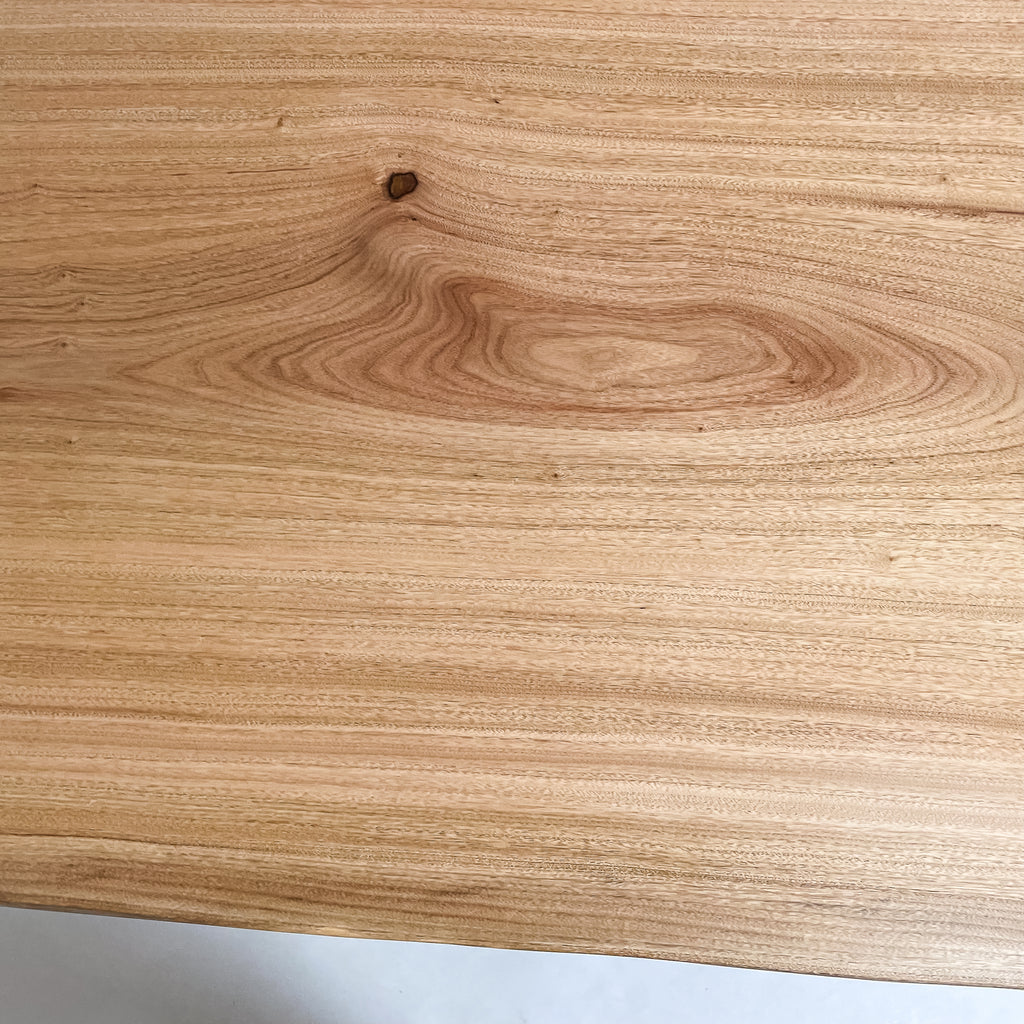 天板中央に広がる年輪のまとまりが、空間に視線の流れを自然に生み出します。奥行きの中で表情が分散し、日常の所作に静かな余白を与えます。