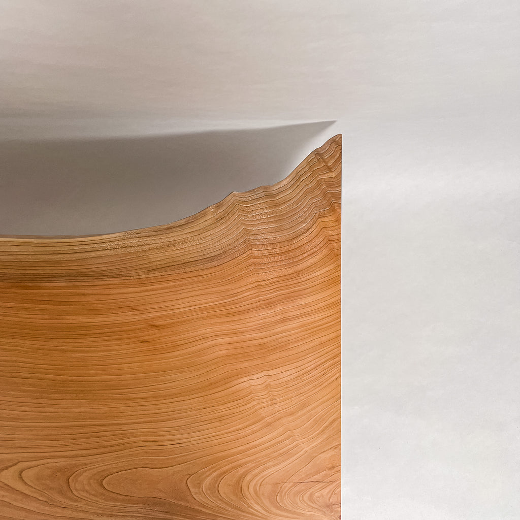 | 自然が生み出した不均一な表情を 読み解き、素材の持つ品格や奥行きが際立つよう、細部まで配慮した加工で完成度を高める。 | 一枚板単体の美しさだけでなく、置かれる空間や光の入り方までを思い描き、その場に自然と溶け込む佇まいへと仕上げる。 | |
