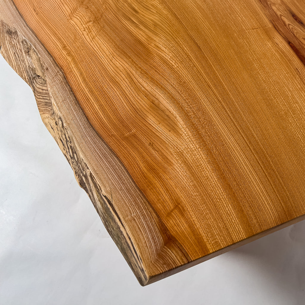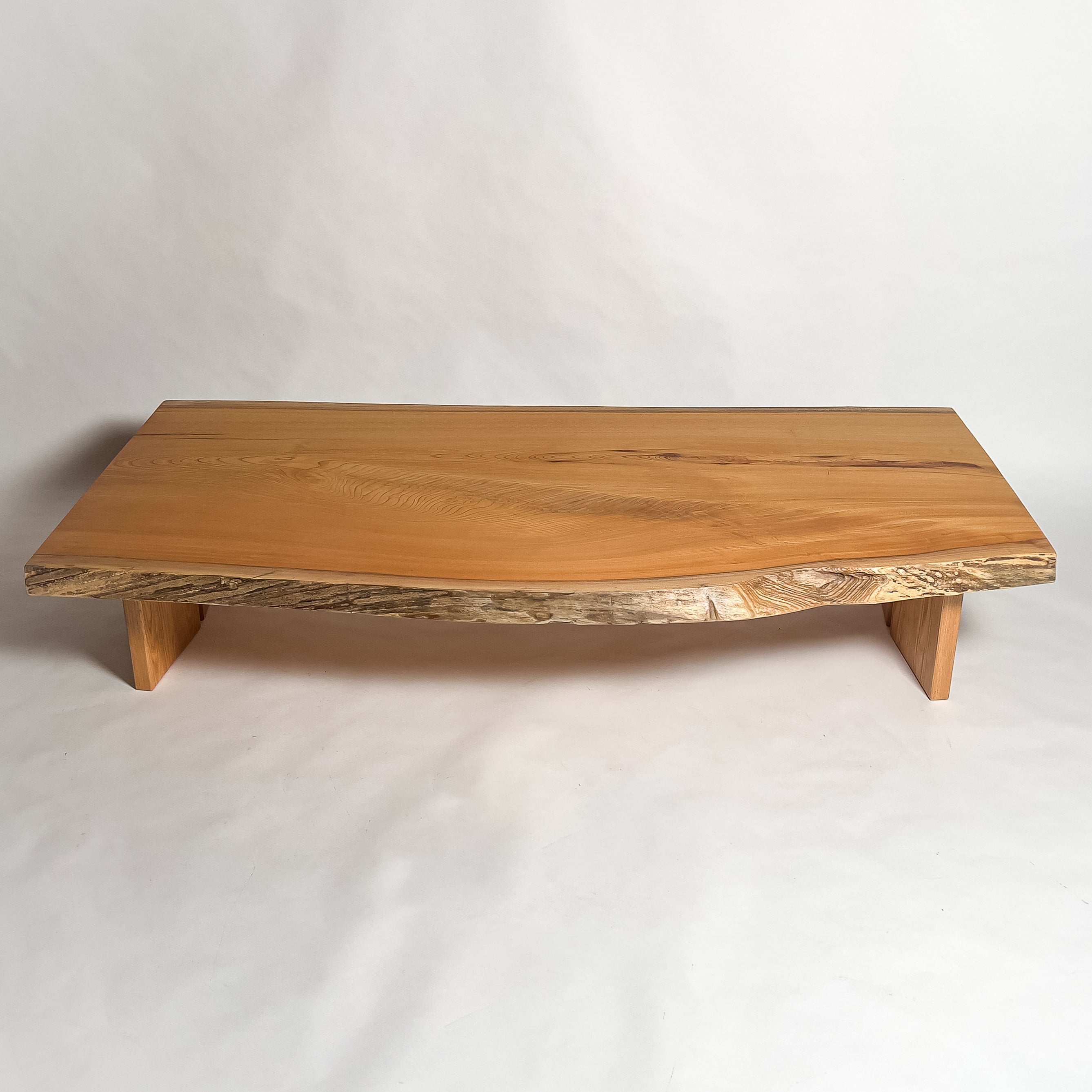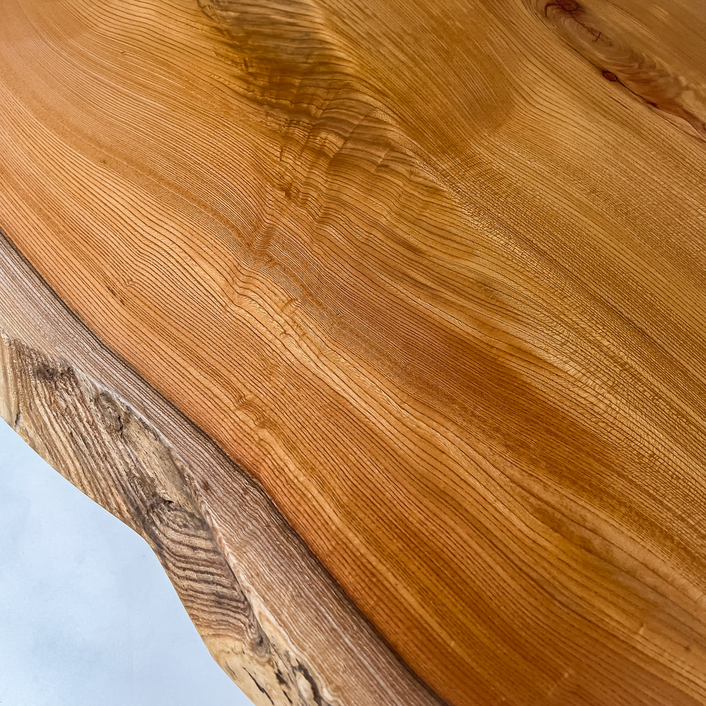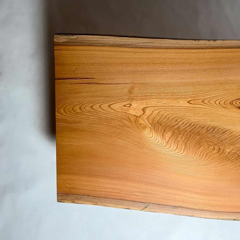 整った流れの木目と穏やかな色味に、自然縁の動きが重なり、空間の軸として佇まう一枚板。