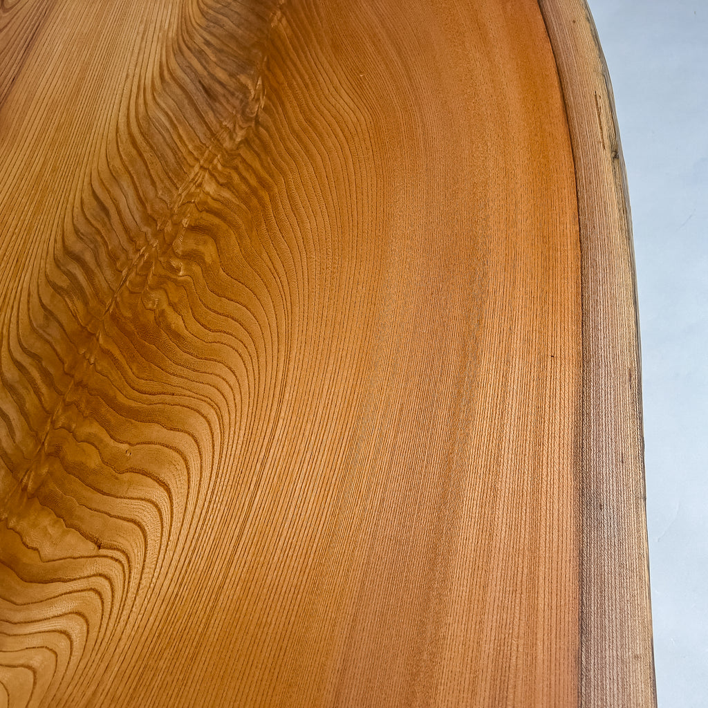 この一枚板の希少性:やや高い 天板中央から端部にかけて、年輪が途切れず弧を描くように広がり、耳際では凹凸が連続して現れています。これらが同時に崩れず残る条件は限られ、同条件での再入荷が難しいため希少性が高いです。 |
