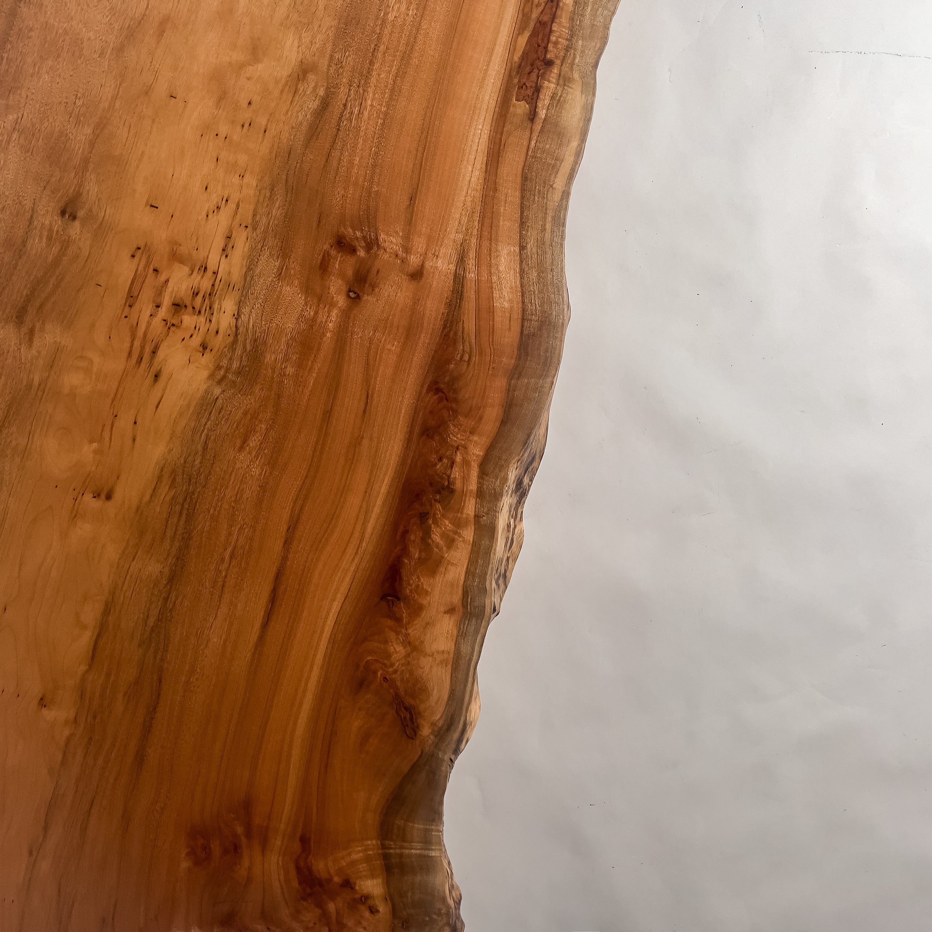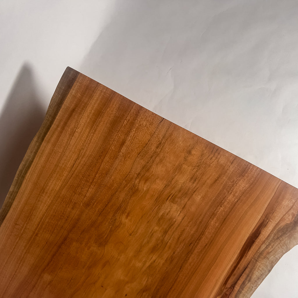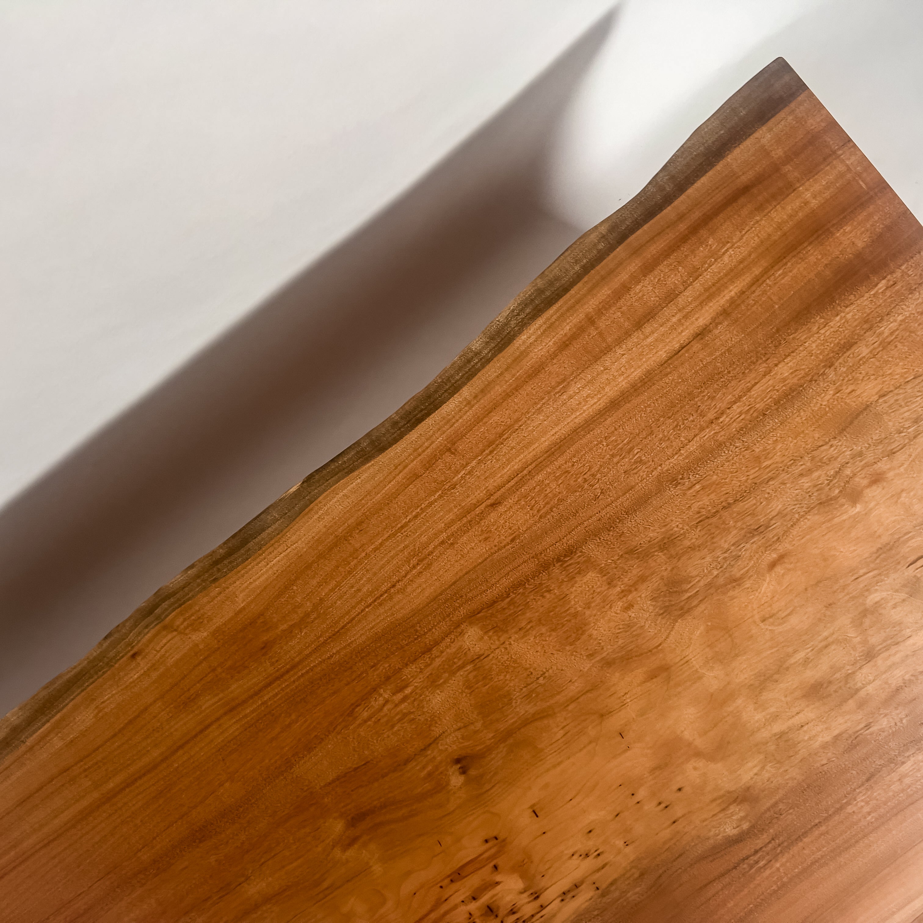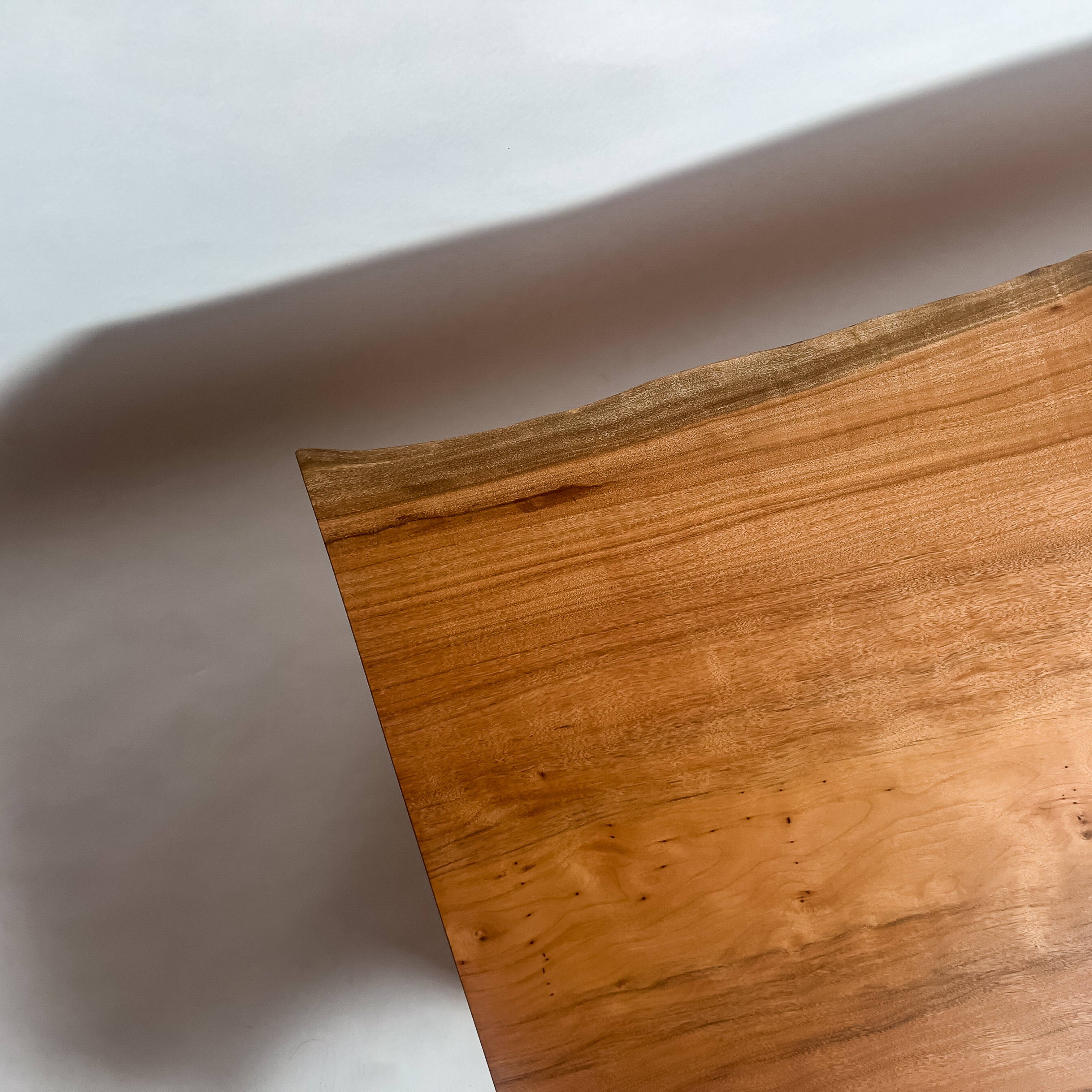 同サイズ帯の中でも、面全体が長手へ素直に流れ、耳側にだけ濃淡のゆらぎが集まるタイプです。整った面と原木の輪郭が同居し、椅子や照明の線を受け止めてくれます。