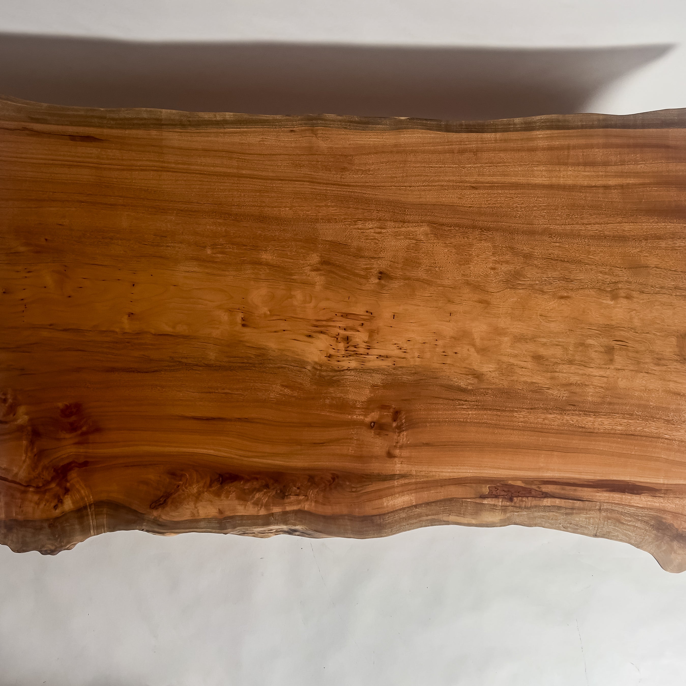 この一枚板の希少性:やや高い 耳側に濃淡の帯と起伏が連なり、面は長手方向へ途切れず走っています。この見え方が揃う奥行きと取り方が限られるため希少性が高いです。 |
