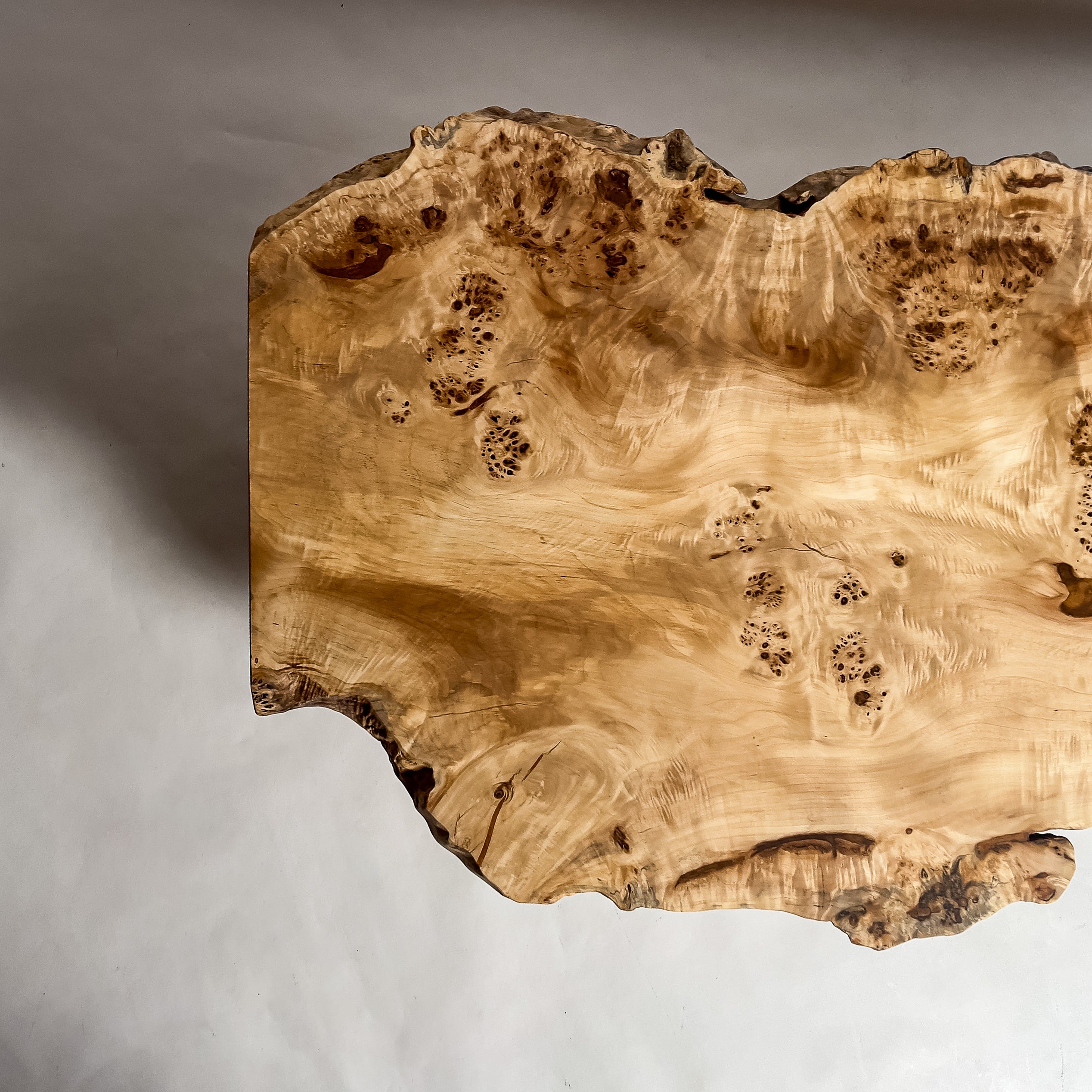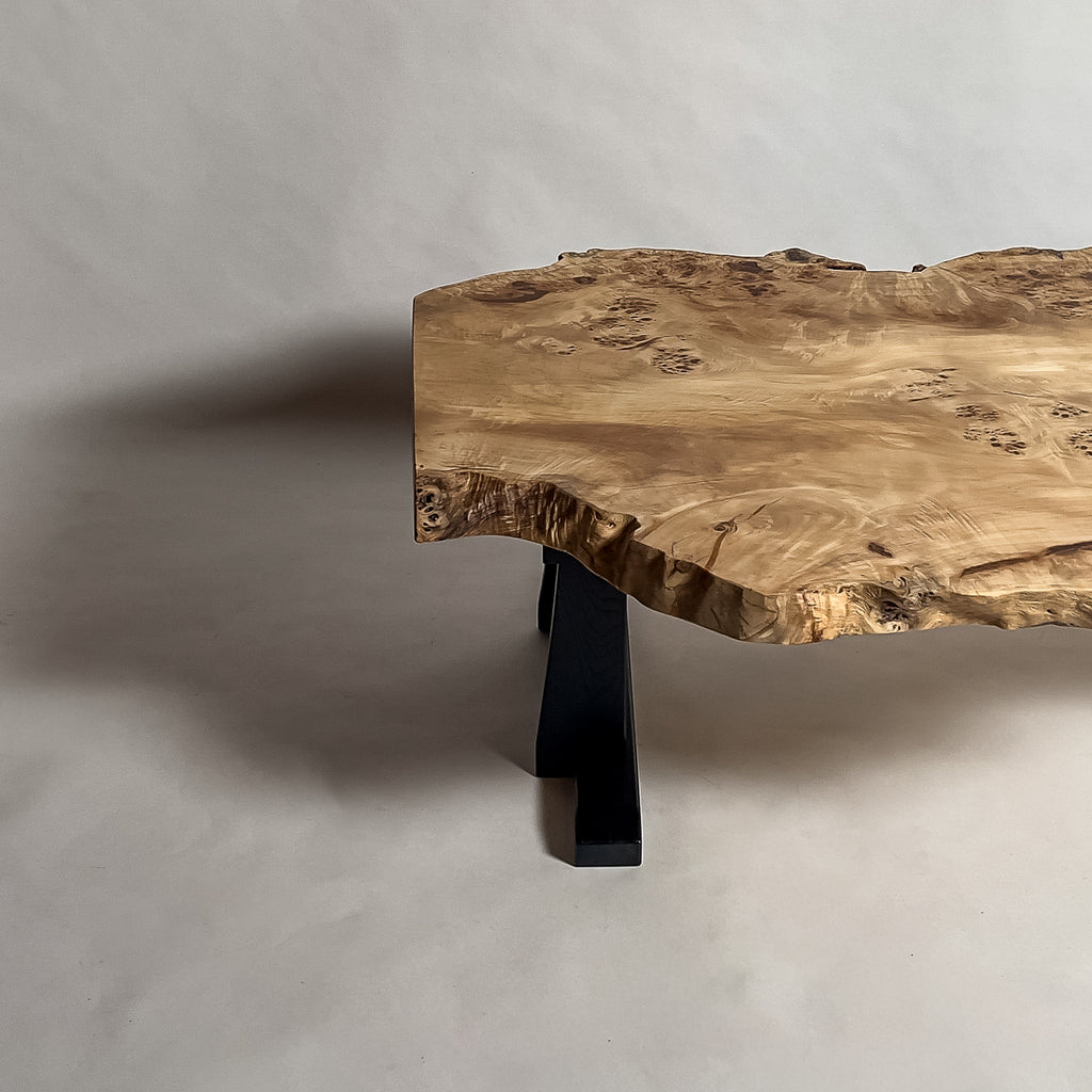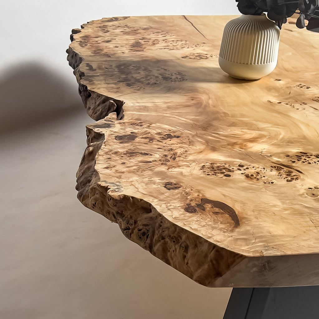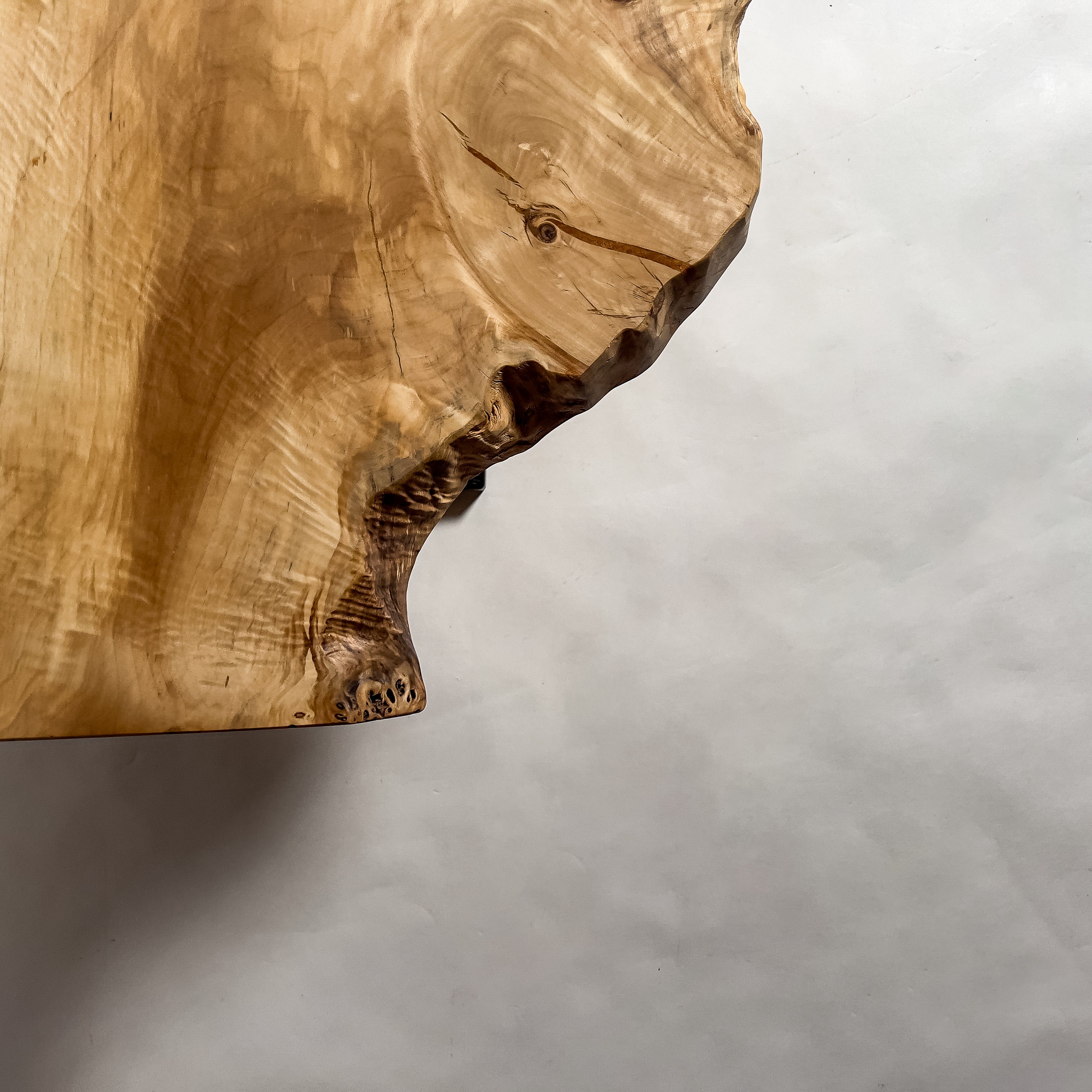 動きのある木目と明るい色味、輪郭の抑揚が重なり、空間に自然な流れをもたらす一枚板。