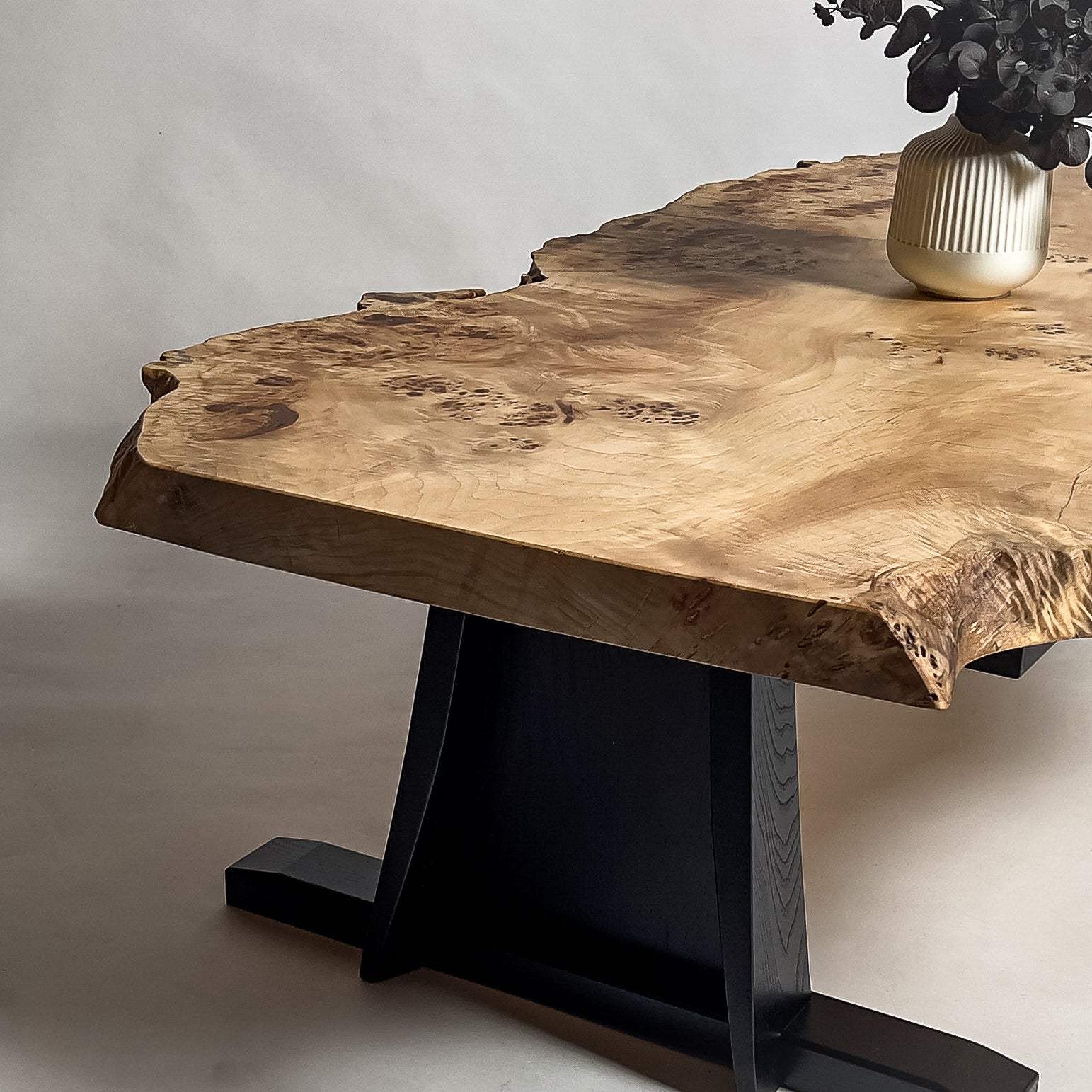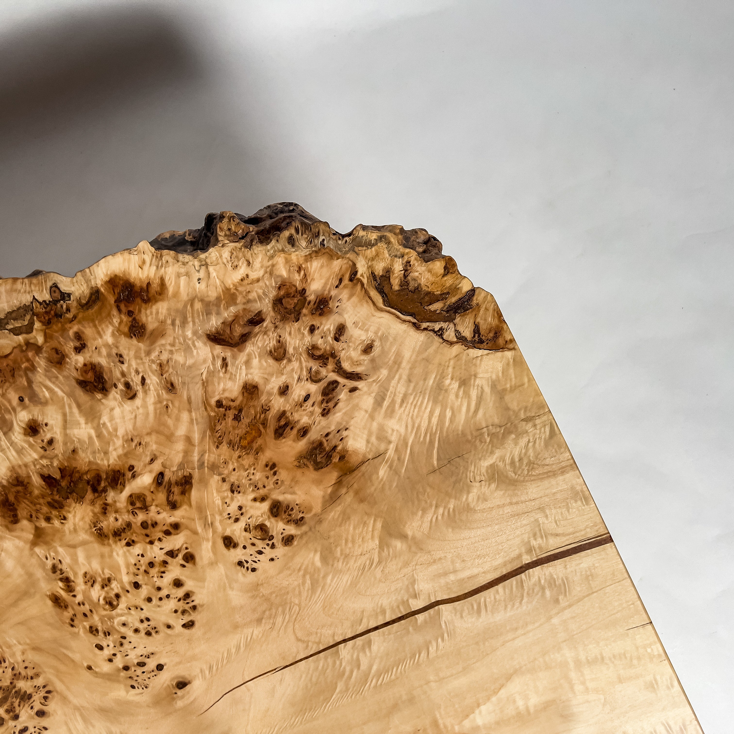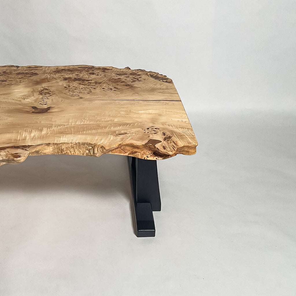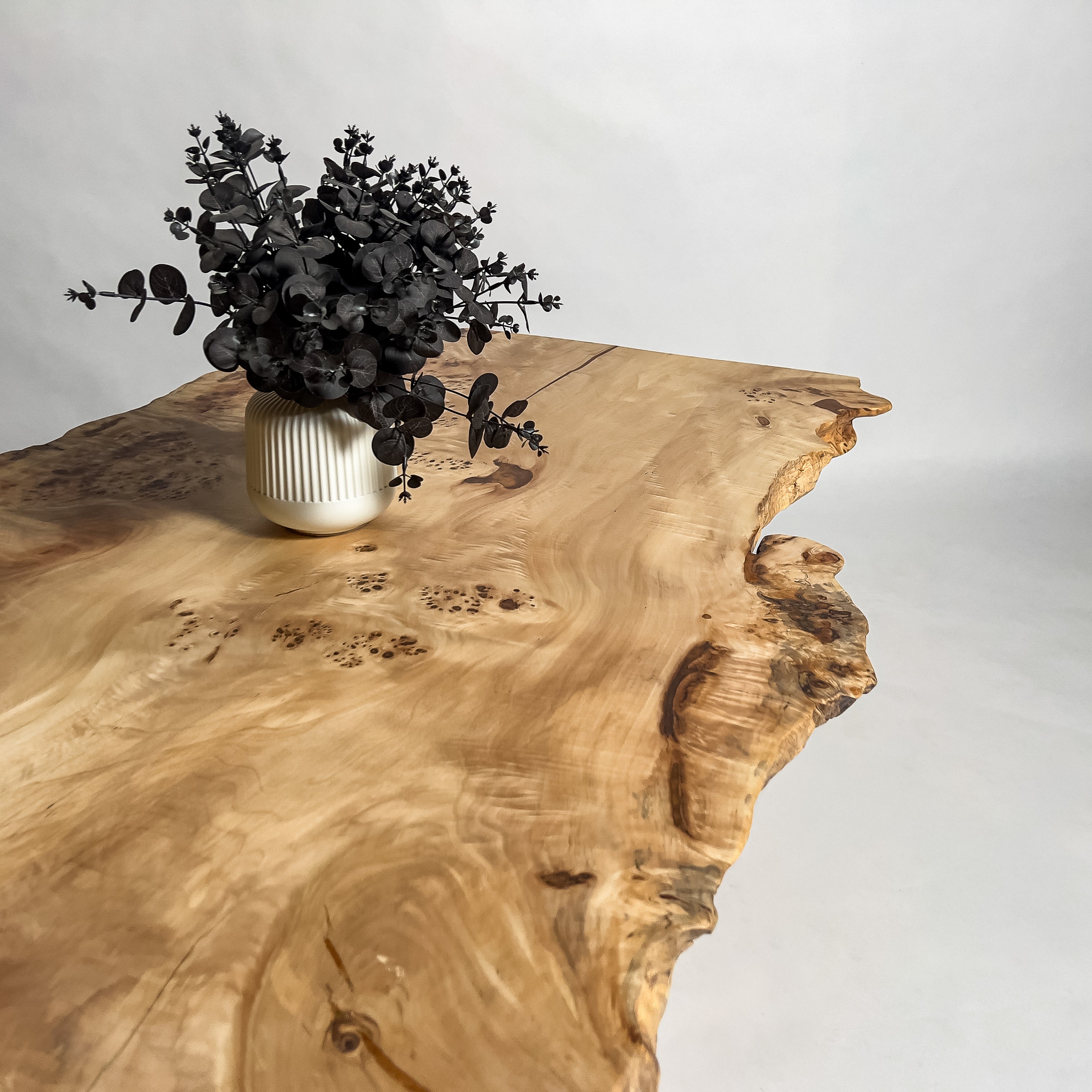 動きのある木目と明るい色味、輪郭の抑揚が重なり、空間に自然な流れをもたらす一枚板。