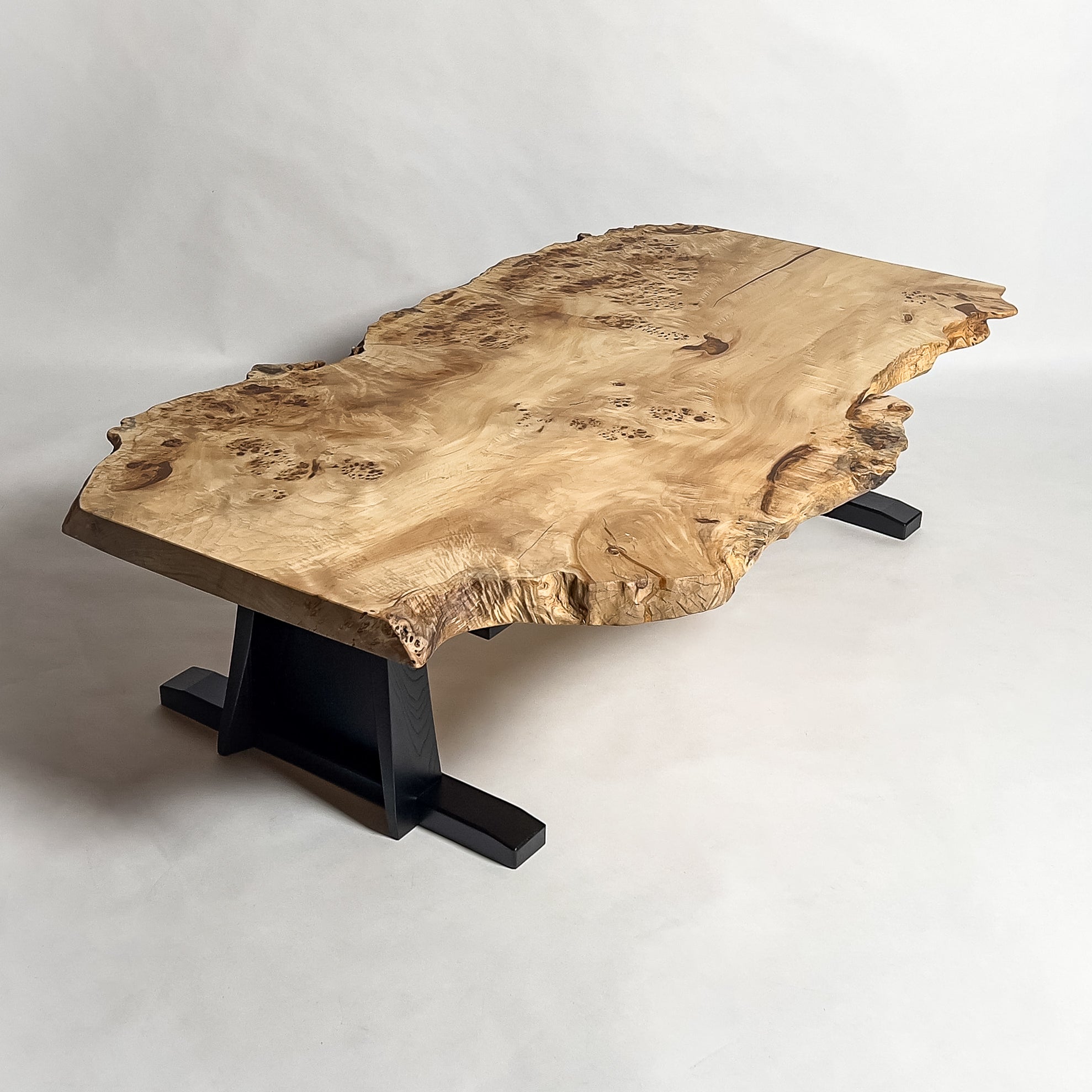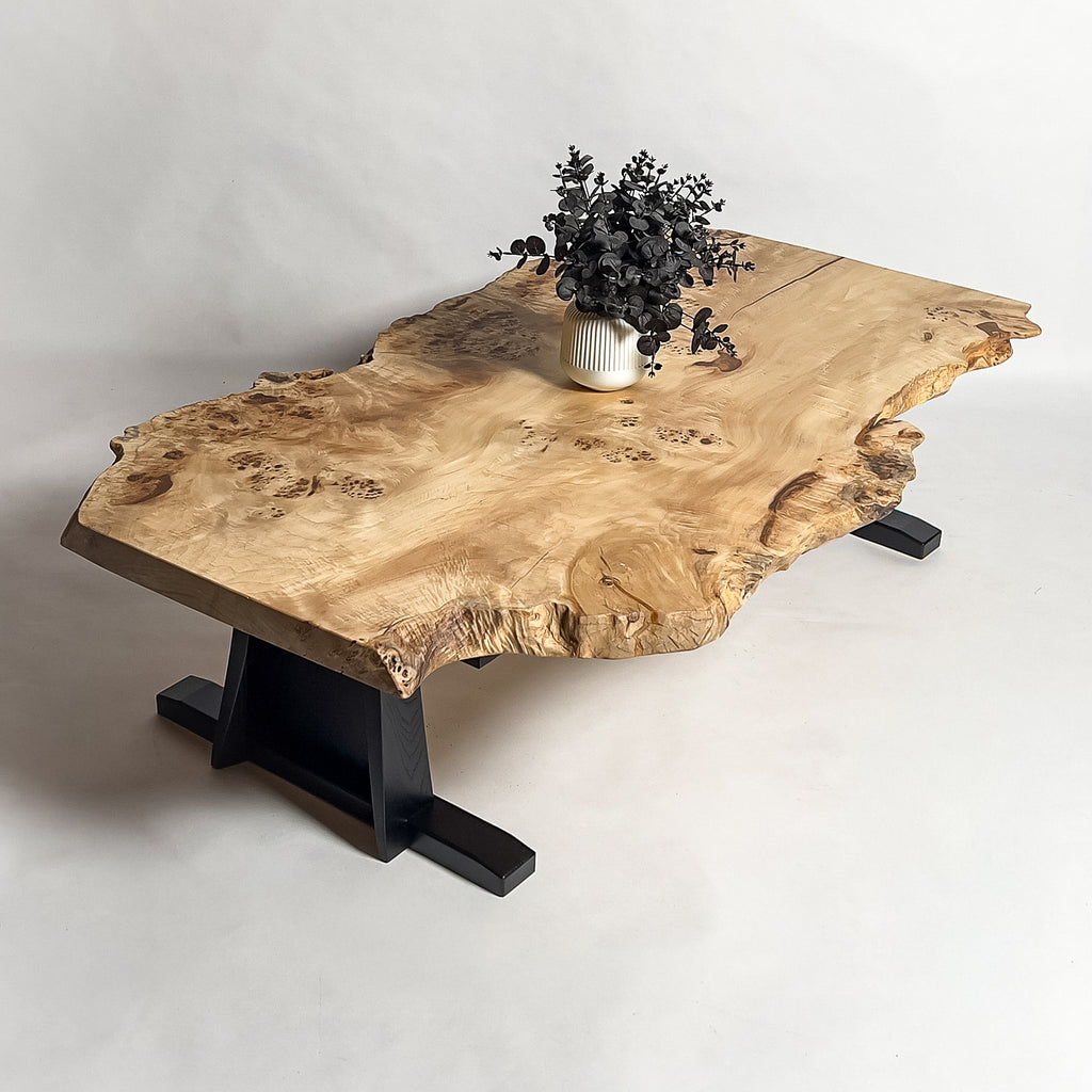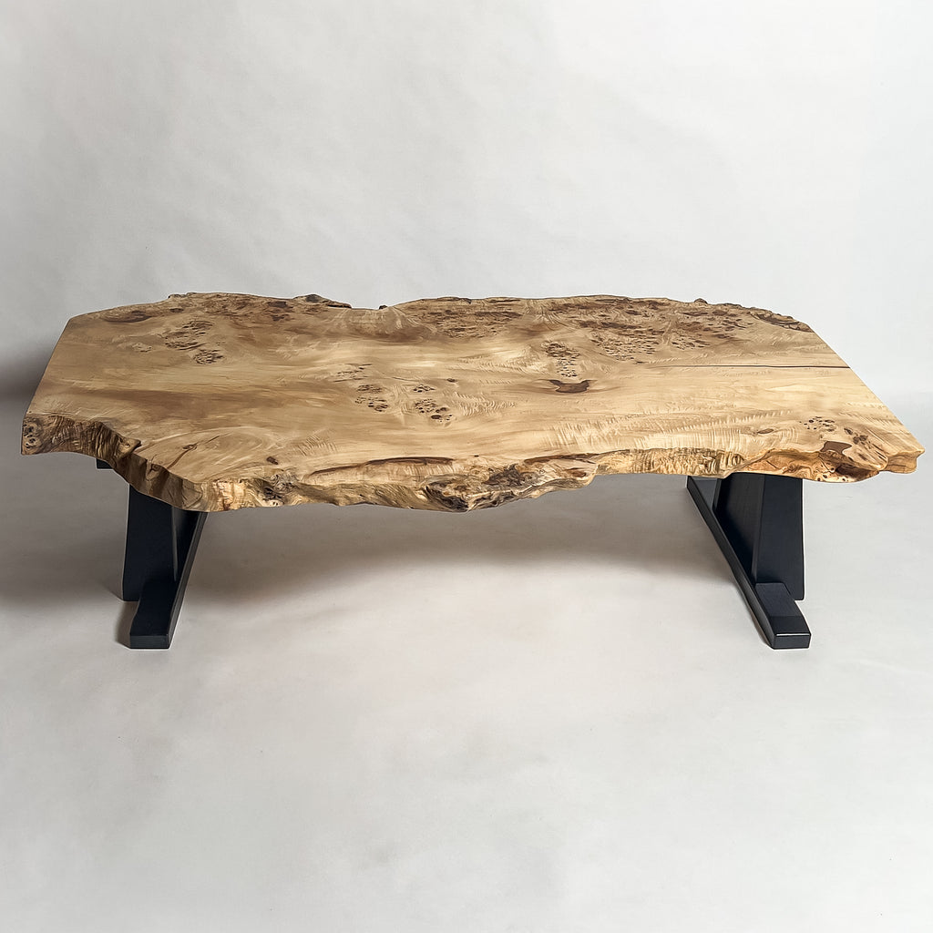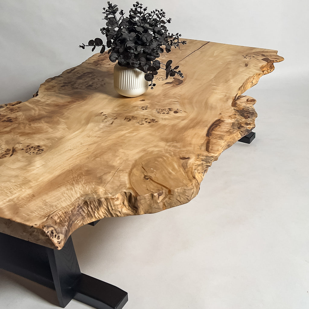 動きのある木目と明るい色味、輪郭の抑揚が重なり、空間に自然な流れをもたらす一枚板。