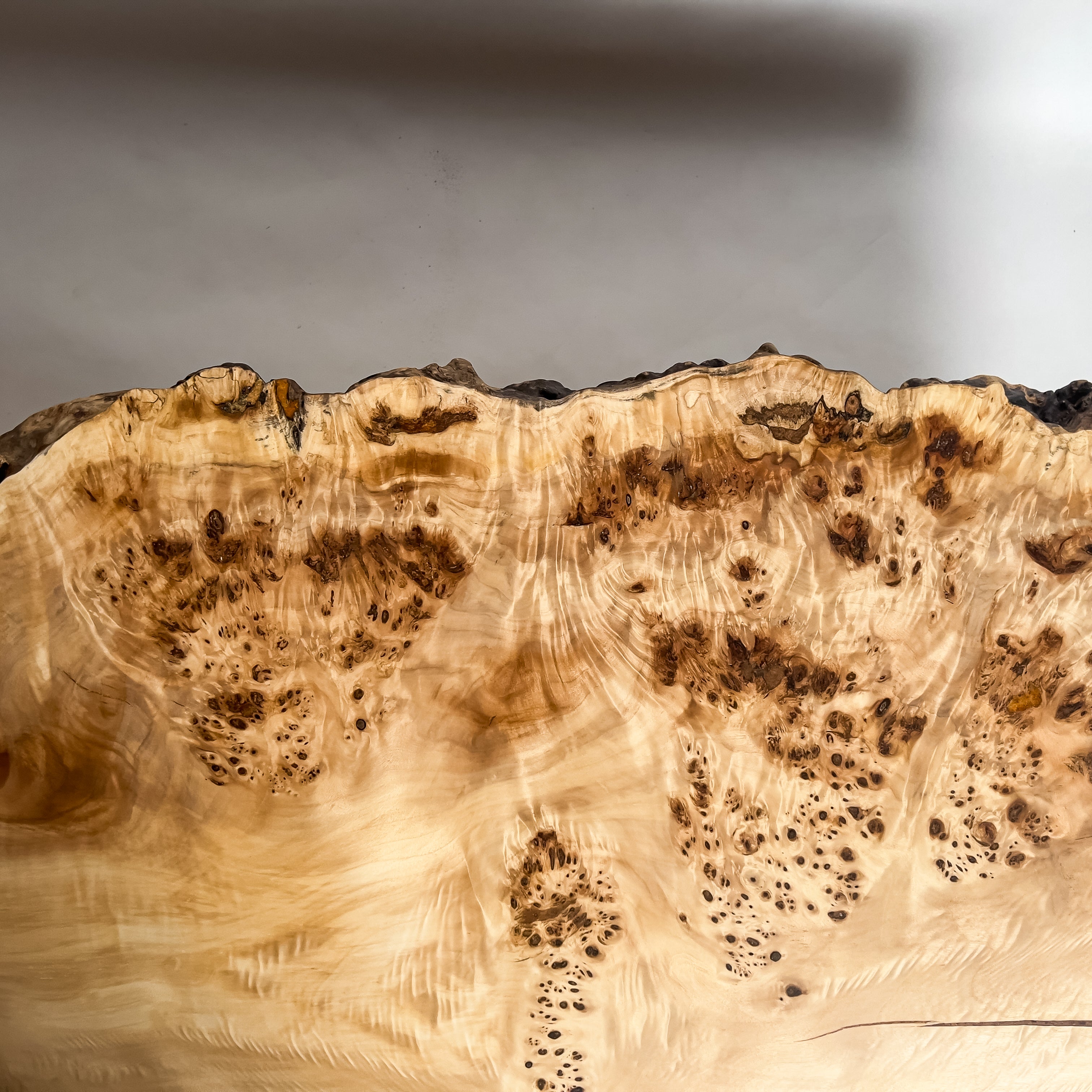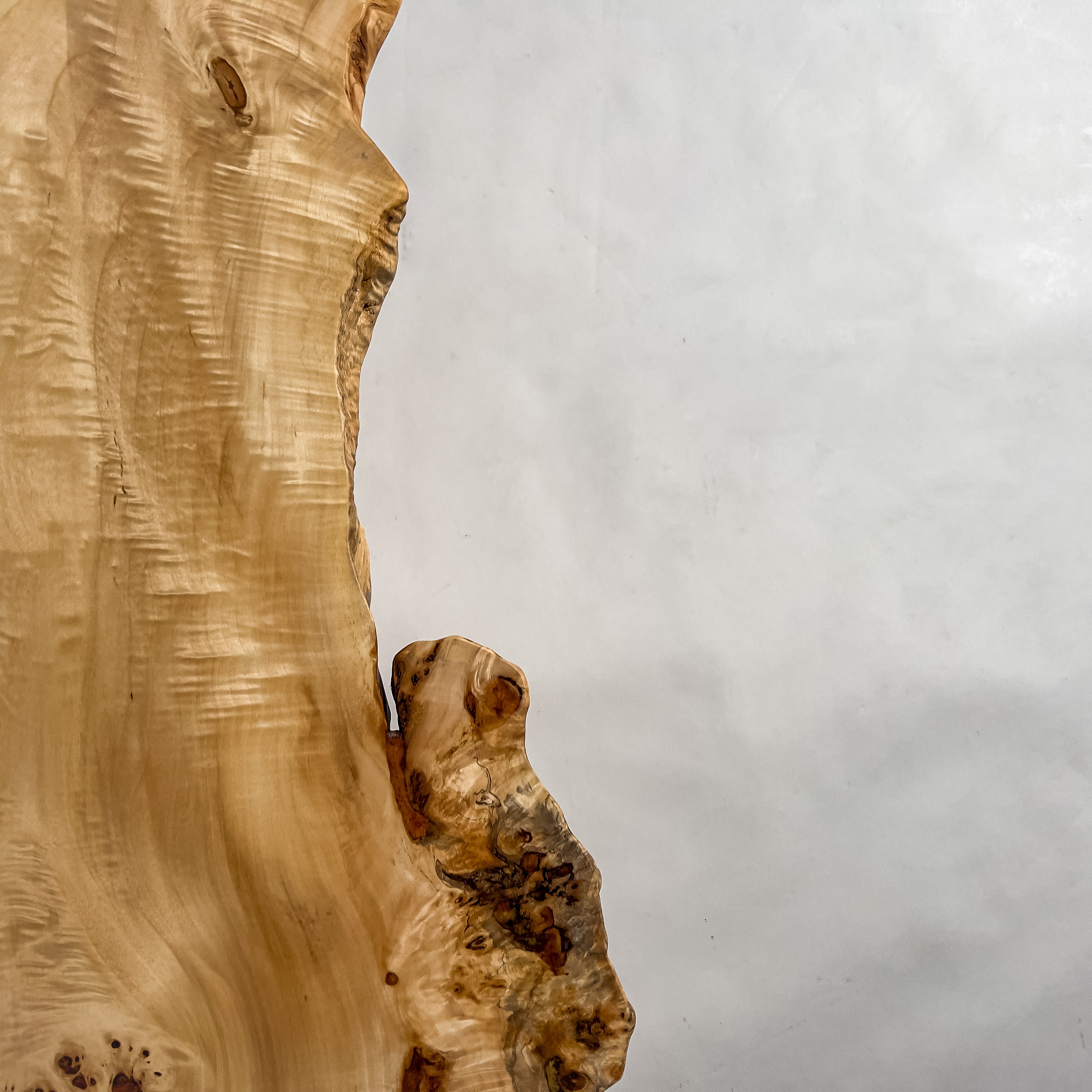 この一枚板の希少性:非常に高い 奥行きの深い範囲で木目のうねりと節周辺の表情が連続し、耳の起伏も同時に現れています。これらが揃う個体は限られ、同条件での再入荷が難しいため希少性が高いです。 |