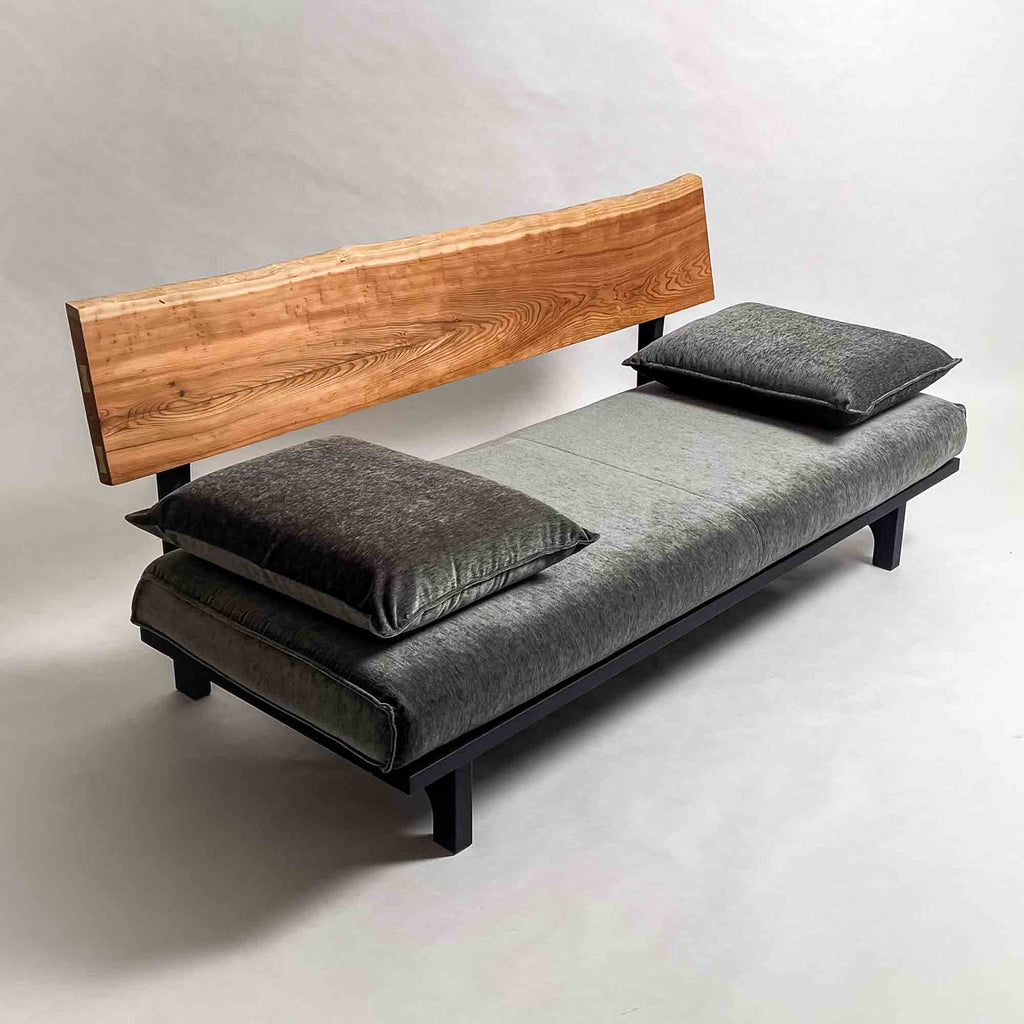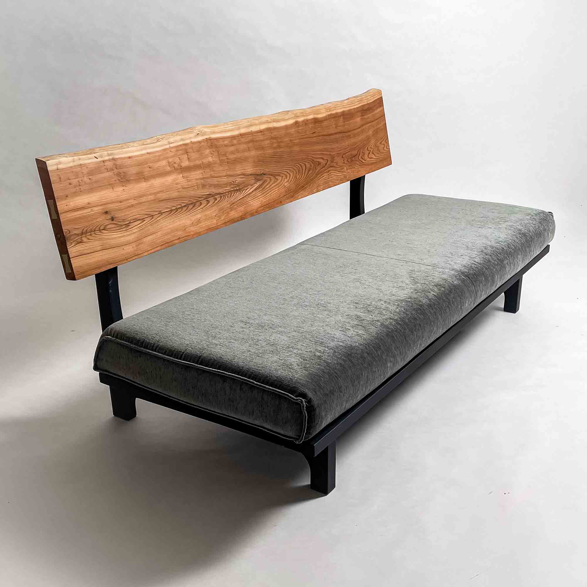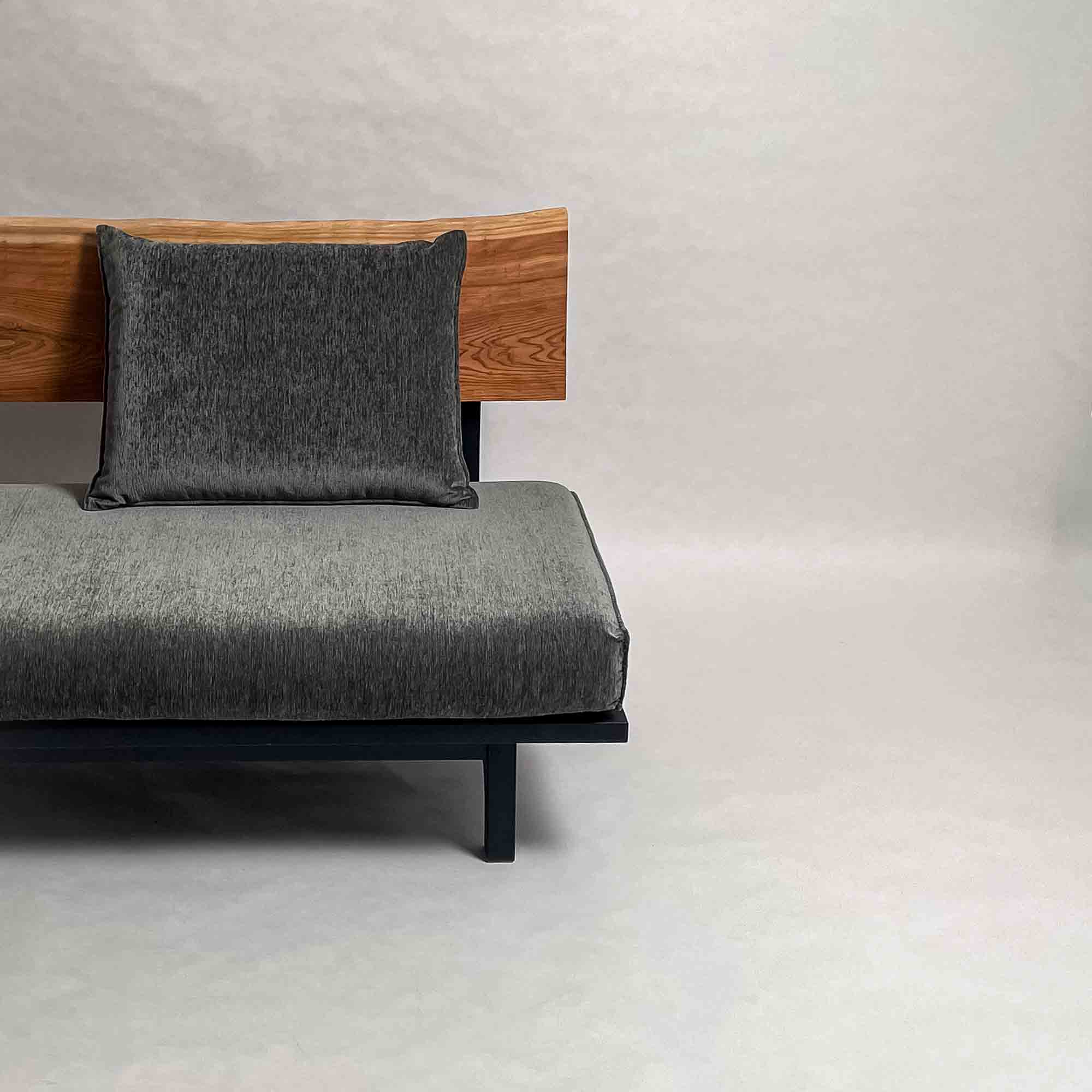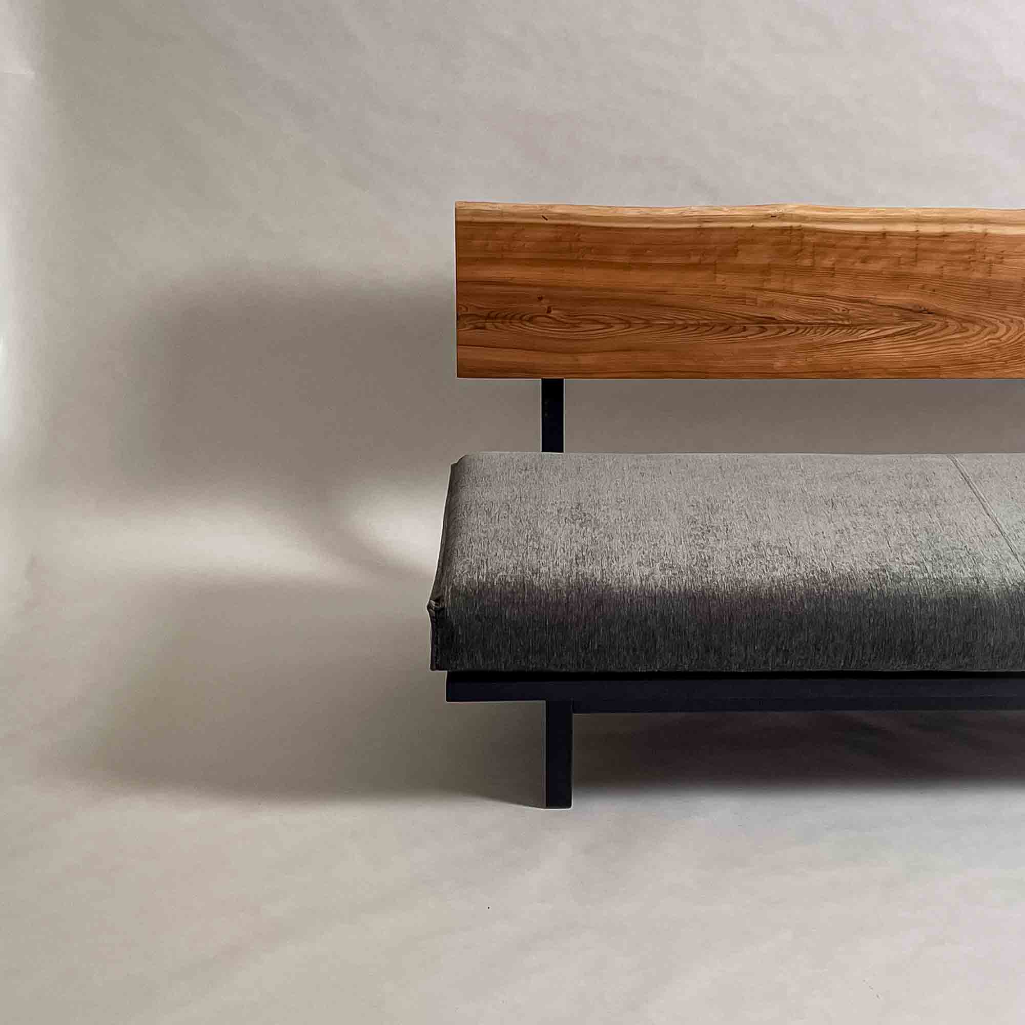 背板の長手方向に連続する木目と面の安定が、座面全体を穏やかに受け止める構成です。視線が左右に流れ、空間に落ち着いたリズムを生みます。
