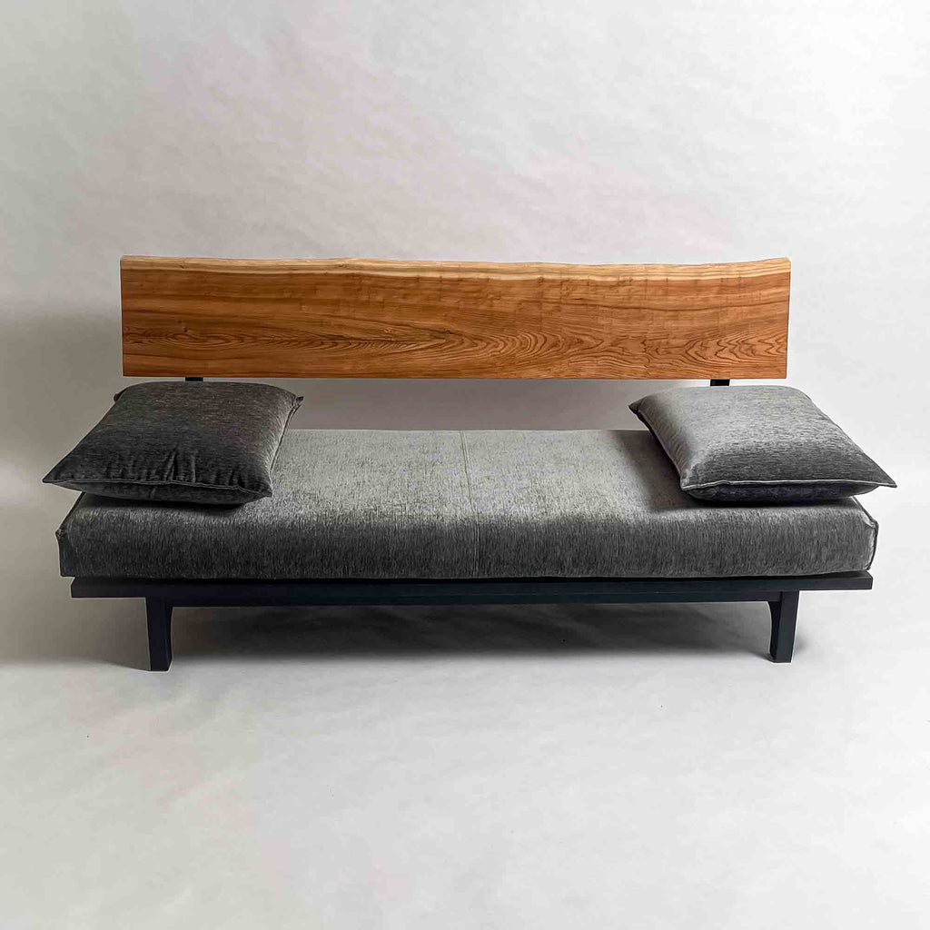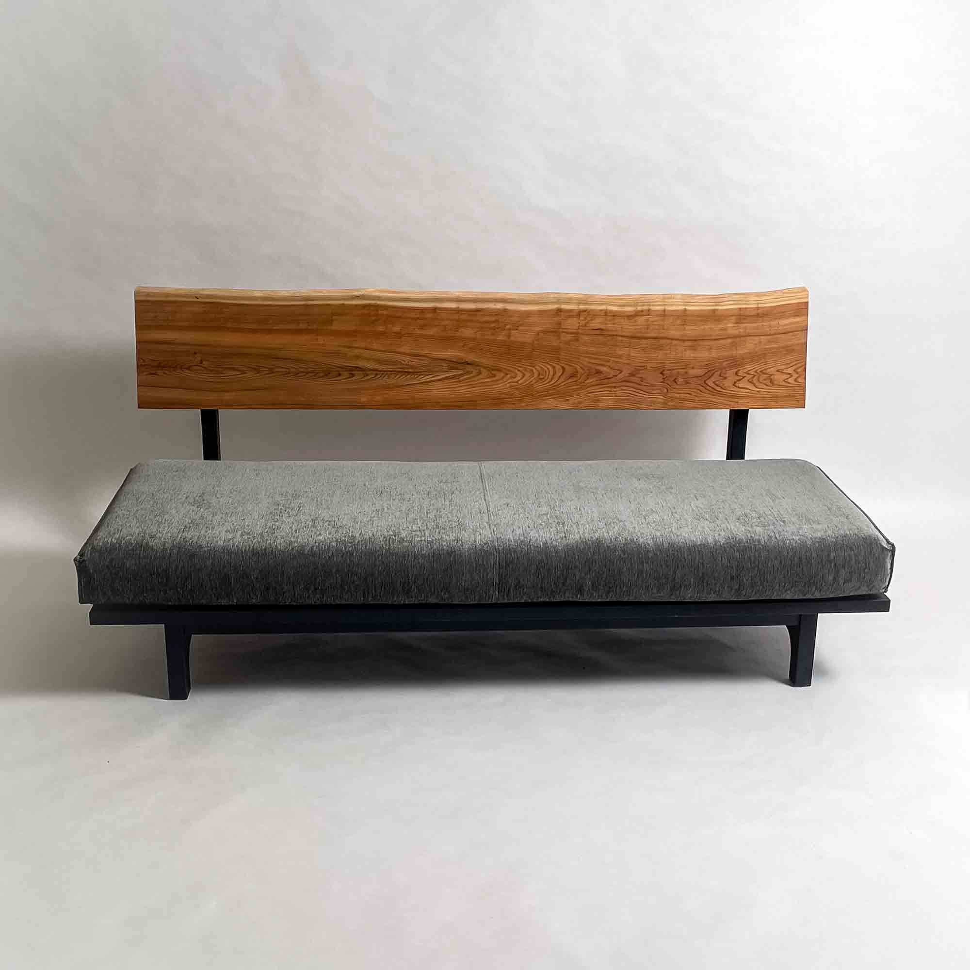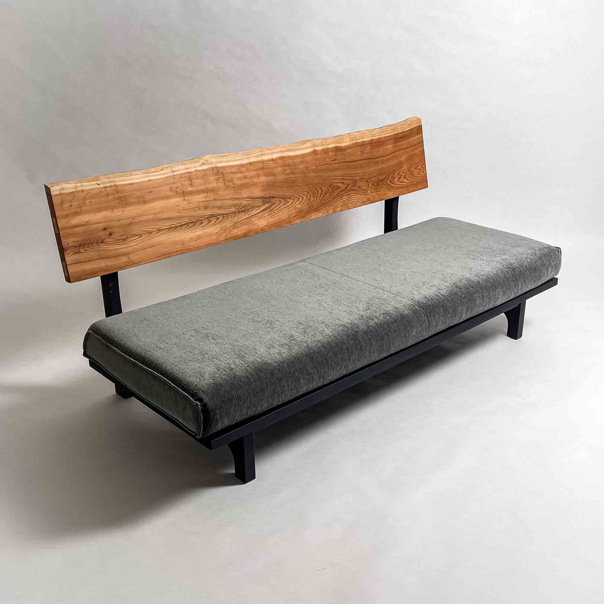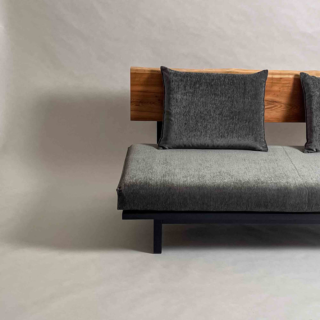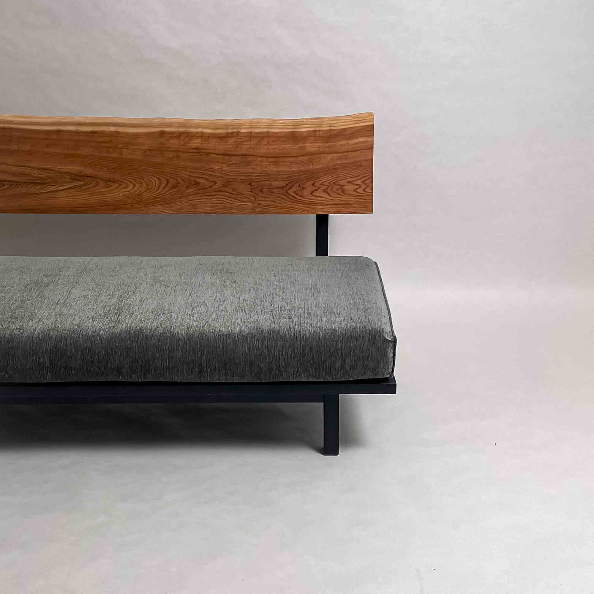 背板の長手方向に連続する木目と面の安定が、座面全体を穏やかに受け止める構成です。視線が左右に流れ、空間に落ち着いたリズムを生みます。