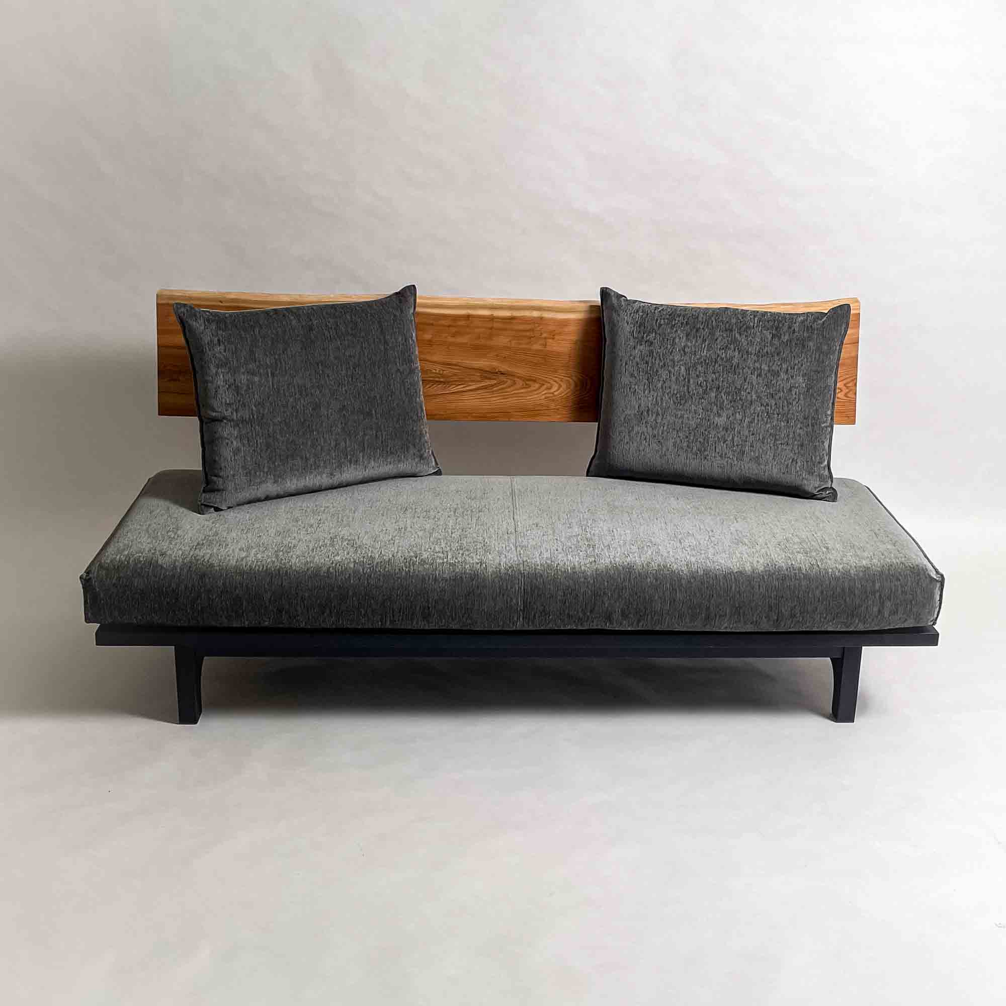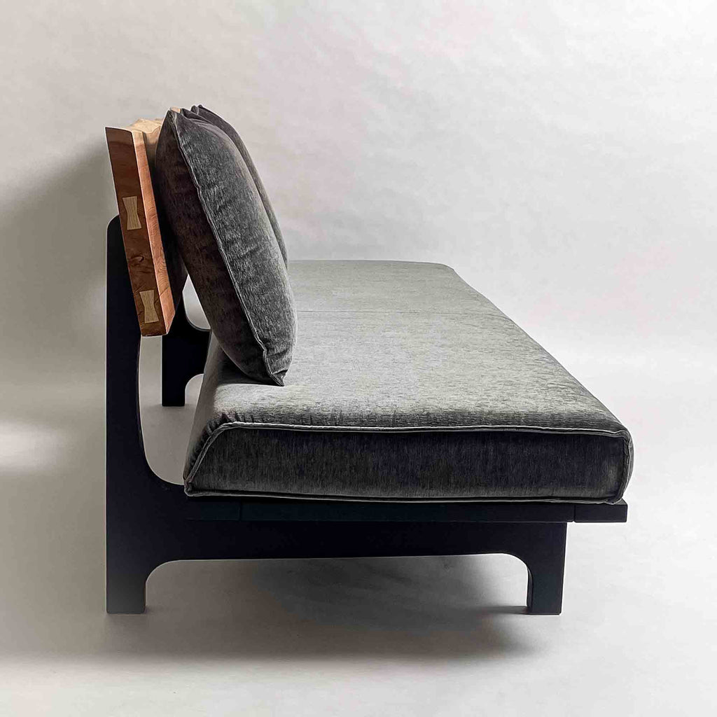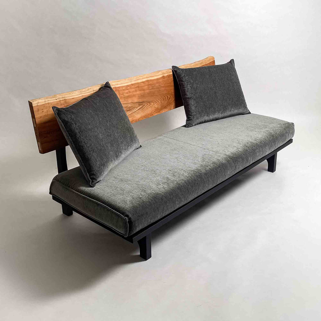 背に沿ってわずかに流れる、横顔の長いソファ